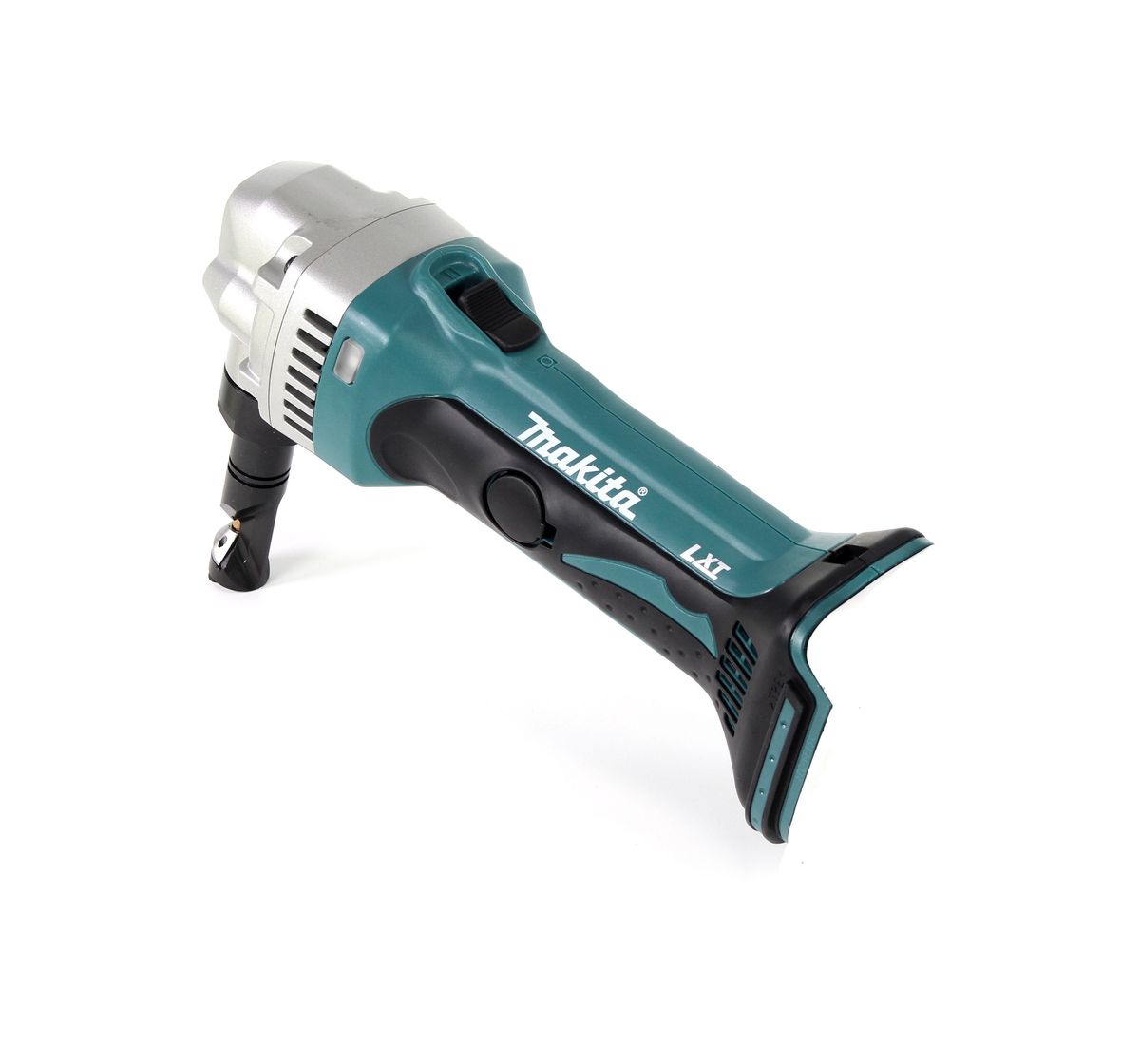 Der handliche Makita DJN Akku-Knabber eignet sich ideal zum Trennen von Blechtafel-, Well- und Trapezblech. Die stufenlos verstellbare Matritze ist um 360° drehbar und verfügt über eine 90° Arretierung. Eine eingebaute LED warnt sowohl vor nachlassender Akkuspannung, als auch vor einer möglichen Überlastung des Geräts. Die Anti-Restart-Funktion verhindert ein unbeabsichtigtes Starten des Knabbers nach einem Akku-Wechsel. Dank der schlanken Bauform stellen auch schwierig zu erreichende Werkstücke kein Problem dar. Mit der Meß-Nut lässt sich die Blechstärke vor der Arbeit messen, sodass eine ideale Ausrichtung der Maschine auf das Werkstück möglich ist.