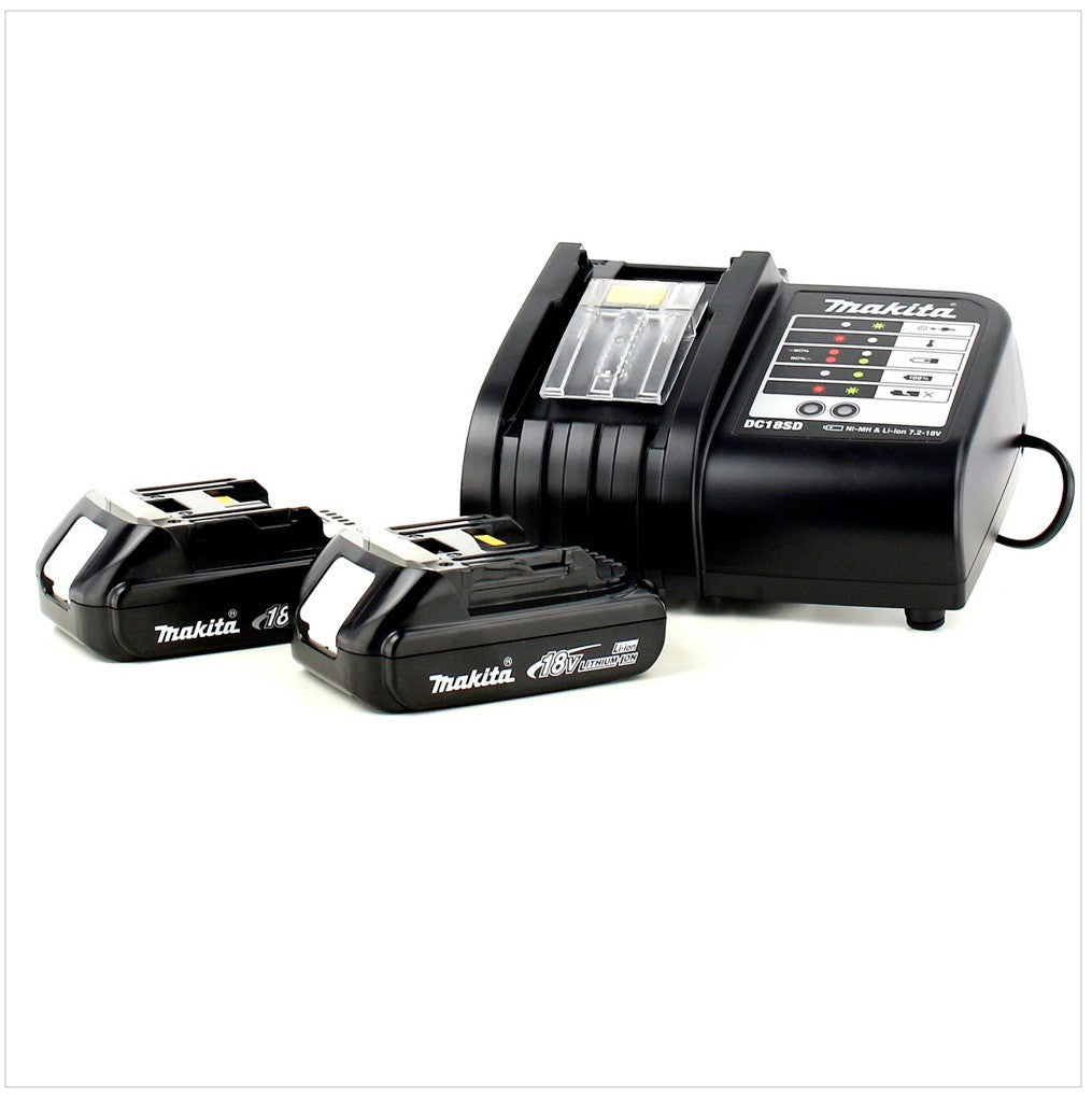 Im Set enthalten sind zwei Makita BL 1815 N 1,5 Ah Akkus, ein Makita DC18SD Ladegerät, ein 17-teiliges Bit- und Bohrer-Set und die passende Makita Tragetasche.