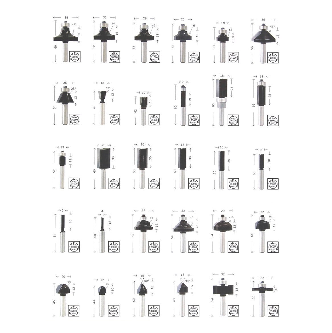 - 5x Abrundfräser 10 x 19 mm ( R= 3 mm ) / 13 x 25 mm ( R= 6 mm ) / 14 x 29 mm ( R= 8 mm ) / 16 x 32 mm ( R= 10 mm ) / 19 x 38 mm ( R= 12 mm )
