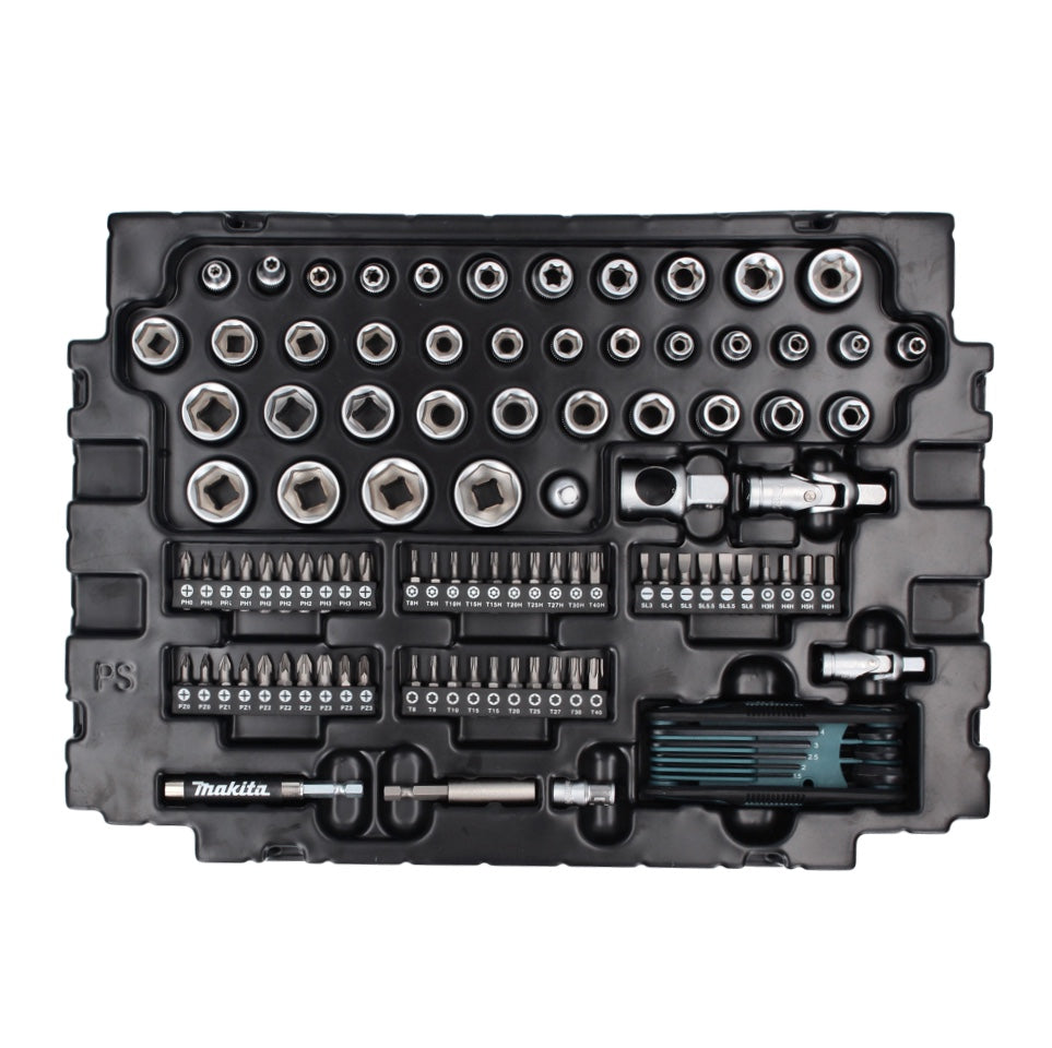 Das Werkzeug Set ( E-08713 ) von Makita enthält 120 klemmgesicherte Werkzeuge, darunter eine Hebel Umschaltknarre, Bits, Steckschlüssel, Steckschlüsseleinsätze, Winkelschraubendreher, Schraubendreher und - schlüssel, Verlängerungen, Gelenke und Adapter. Die 72- fach verzahnte Umschaltknarre mit 2- Komponenten- Griff bietet einen Rechts/Linkslauf (durch Hebel umschaltbar). Das umfangreiches Werkzeug Set eignet sich für die Werkstatt, für die Montage, für Baustellenfahrzeuge und für Privatpersonen. Die Werkzeuge sind aus Chrom Vanadium Stahl hergestellt. Das Set wird in einem robusten Makpac Gr. 1 geliefert. Ideal geeignet zum Beispiel für Automechaniker, Hausmeister oder Heimwerker, der wert auf Qualität legt. Makita ist ein führender Elektrowerkzeughersteller, der durch lange Tradition und Qualität überzeugt.