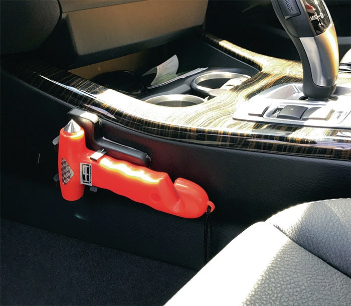 mit Gurtmesser · aus robustem Kunststoff, mit Reflektoraufkleber · Hammerspitze aus spezial gehärtetem Stahl · Gurtmesser im Griff · schnell zur Hand durch mitgelieferte Halterung · Befestigungsmaterial nicht enthalten · SB Verpackung