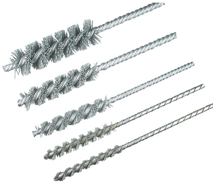 Besatzmaterial aus Siliciumcarbid · verzinkte, vierfache Drahtseele mit einfacher Besatzspirale · unentbehrliche Bürsten bei der Innenbearbeitung von NE-Metallen und Hydraulikguss · besonders geeignet zum Entgraten von Querbohrungen, Steuerteilen, O-Ring-Einstichen und zylindrischen Bohrungen an vielen Werkstücken · sowohl als Handwerkszeug als auch eingespannt in Handschleifern ergeben sich gute Arbeitsergebnisse