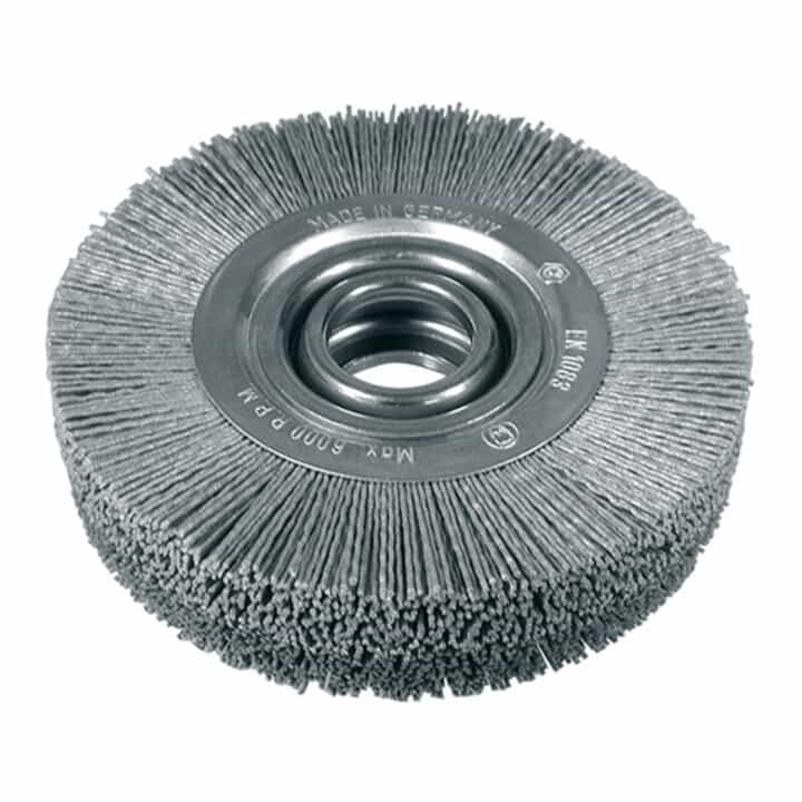 Schleifnylon-Rundbürste mit Siliciumcarbid für die Fertigbearbeitung · zum Einsatz auf Polierbockmaschinen und CNC-Maschinen · Bohrung 31,75 mm Ø · Vorzüge: gleichmäßige Schleifwirkung, da sich bei der Abnutzung des Trägermaterials ständig neues Schleifmaterial freisetzt hohe Elastizität und Flexibilität ohne Bruchgefahr kein Zusetzen der Besatzfläche mit Arbeitsrückständen für Nass- und Trockenarbeit geeignet, da Nylon keine bedeutenden Mengen an Kühl- oder Schmiermittel absorbiert beständig gegen schwache Säuren und Laugen kein Nachschneiden des Besatzes bei normaler Anwendung erforderlich hohe Standzeit bei optimalen Voraussetzungen entsprechende Drehzahl (22 m/sek) geringer Anpressdruck geringe Wärmeentwicklung Anwendungsbereiche: Entfernen von leichtem Rost bei Autokarosserien Entgraten und Feinschleifen von Lamellen, Leiterplatten und gedruckten Schaltungen Entgraten von Schnitt- und Stanzgraten Kunststoff, Aufrauen und Mattieren Schleifen von Holz und Sperrholz