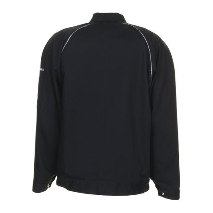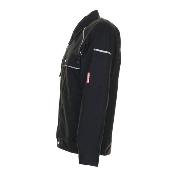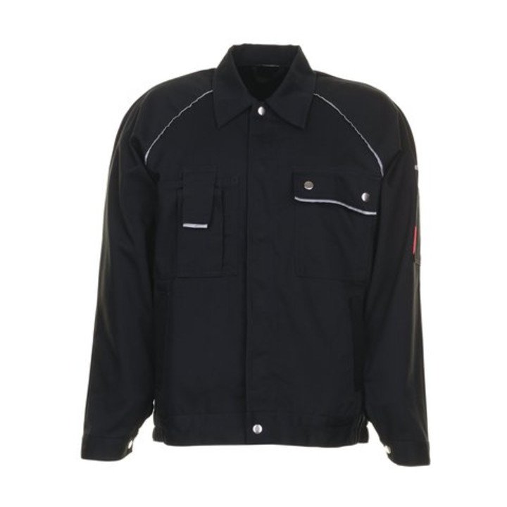 65% Polyester / 35% Baumwolle · Canvas- Bindung · ca. 320 g/m² · Geweberückseite sehr atmungsaktiv, besonders strapazierfähig, einlauffest nach DIN EN ISO 6330 · 2 eingesetzte Beuteltaschen aus Cordura® · Reflexbiesen am Ärmeleinsatz und an den Taschenpatten · 2 Brusttaschen, links mit Patte und Druckknöpfen, rechts mit zusätzlich aufgesetzter Handytasche · Ärmeltasche links mit aufgedoppelten Stiftfächern · Gummizug im Bund · verdeckte Druckknopfleiste als Frontverschluss · mit Druckknopf verstellbare Ärmelbündchen auf Anfrage lieferbare Größen: 42-64, 90-110 und 24-27
