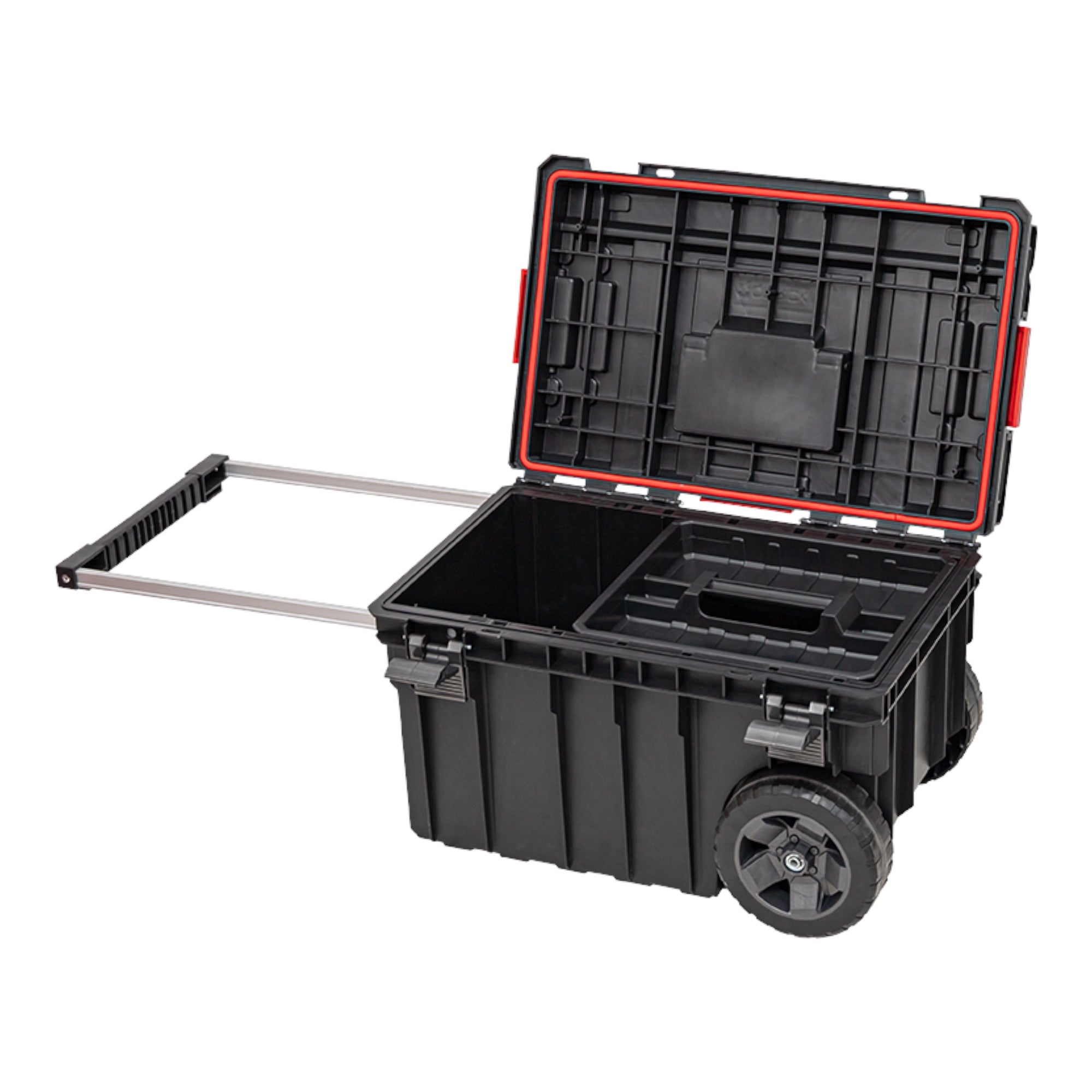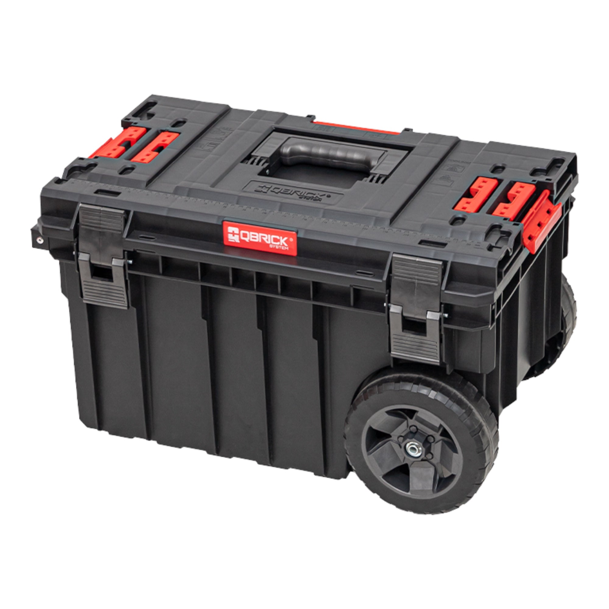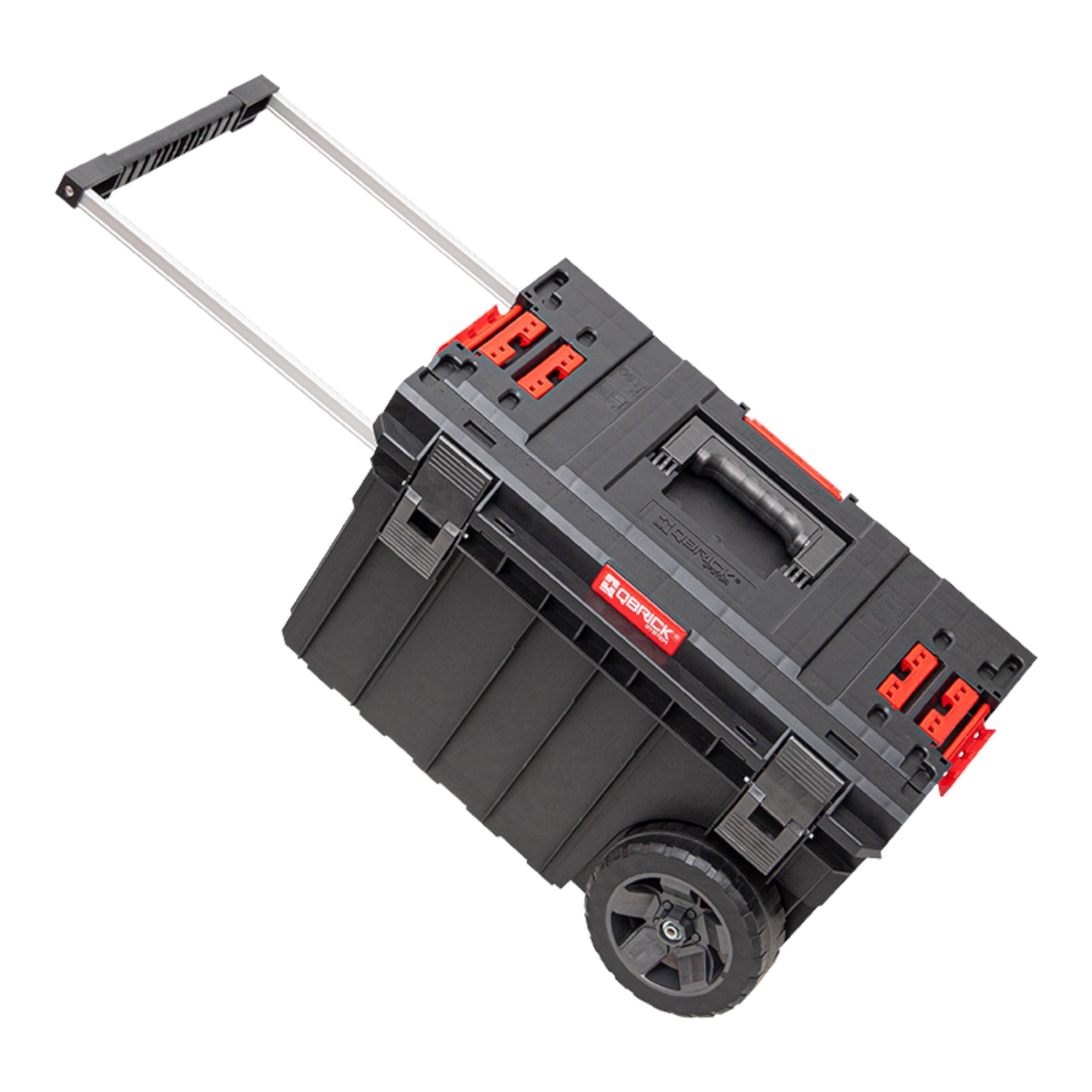 Große Werkzeugkiste auf Rädern für hervorragende Mobilität der Qbrick-Baukastensysteme. Zwei auf einer Metallachse montierte Auflaufräder ermöglichen den sicheren Transport von Boxensets und Organizern. Der seitlich ausziehbare Teleskopgriff aus Aluminium bietet bequemen Zugang zum Inneren der Box und ermöglicht das bequeme Tragen der Box in Verbindung mit anderen Elementen der ONE-Linie, die mit Polyamidverbindern befestigt sind. Der einfache Auszugsgriffmechanismus des Doppelteleskops rastet ein, wenn Sie leicht von unten auf den Griff schlagen. Der Inhalt der Box ist mit einer praktischen Schale und einer flexiblen Dichtung ausgestattet, die den Inhalt der Box vor dem Eindringen von Staub und Wasser schützt. Die Standard-VARIO-Abdeckung ist mit zusätzlichen Anschlüssen ausgestattet, die es ermöglichen, diese Version der Abdeckung mit den Toolbox-Modellen aus der Qbrick System PRO-Linie (500, Toolcase, Toolbox, Organizer 100, 200, 300 und alternativ PRO 600) zu verbinden. Dies ist eine einzigartige Version der Box, dank der der Benutzer Elemente aus zwei Produktlinien kombinieren kann.