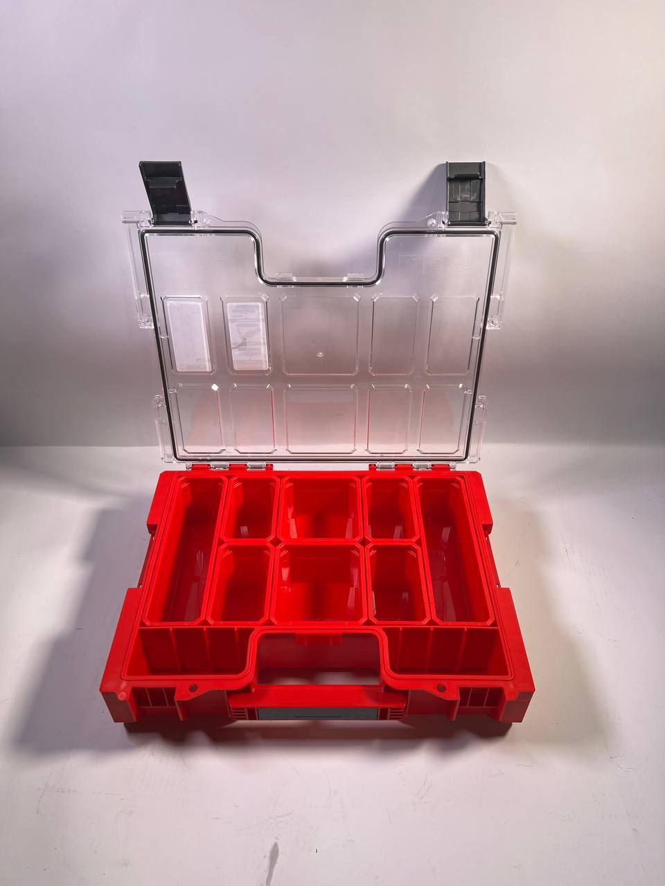 RED ULTRA HD ist eine Sonderedition von Qbrick System PRO-Produkten aus ultrabeständigem Kunststoff, der sich durch außergewöhnliche Beständigkeit gegen mechanische Beschädigungen auszeichnet. Die durchgeführten Schlagtests bestätigen seine außergewöhnliche Haltbarkeit, auch bei Bedingungen unter 0 °C. Qbrick System PRO Organizer 300 ist das größte Organizer-Modell aus der PRO-Linie. Neben den von anderen Modellen bekannten Lösungen, wie dem patentierten Easy Access System, einer Dichtung im Deckel, einem superstabilen Polycarbonat-Deckel, Polyamid-Seitenverbindern und -Frontverschlüssen und einem starken Griff, bietet es einen tieferen Körper, der macht es packbarer. Es ist mit 8 Eimern in verschiedenen Größen ausgestattet, darunter zwei lange Eimer zur Aufbewahrung von langem Werkstattzubehör.