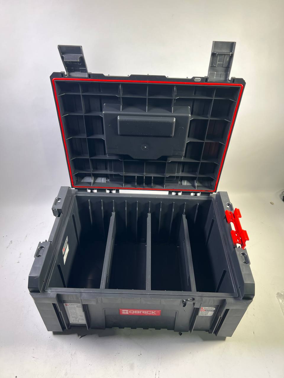 Die Qbrick System PRO Toolbox ist eine geräumige, modulare Werkzeugbox, die bereits standardmäßig eine breite Palette an Zubehör bietet: eine im Deckel integrierte flexible Dichtung, die eine hohe Beständigkeit gegen das Eindringen von Staub und Wasser gewährleistet, 3 verstellbare Fächer, eine geräumige Ablage sowie seitliche Verbindungs- und Befestigungselemente aus super strapazierfähigem Polyamid vorne. Spezielle Führungen in der QS PRO Toolbox ermöglichen es Ihnen, die QS TWO Multi Organizer zu platzieren, die der Aufbewahrung von kleinem Werkstattzubehör dienen.
