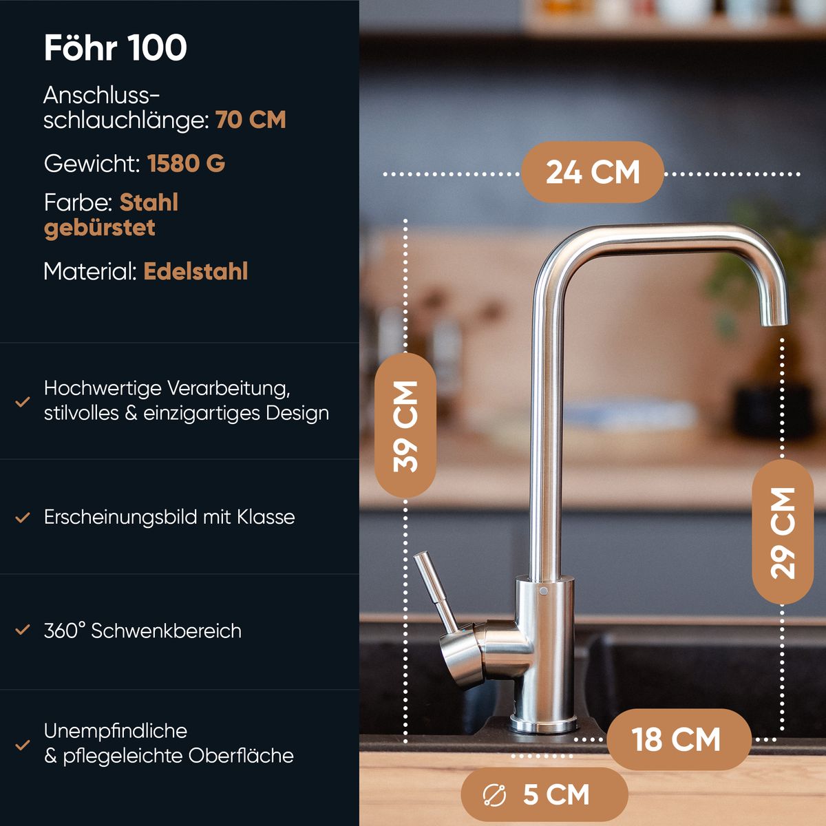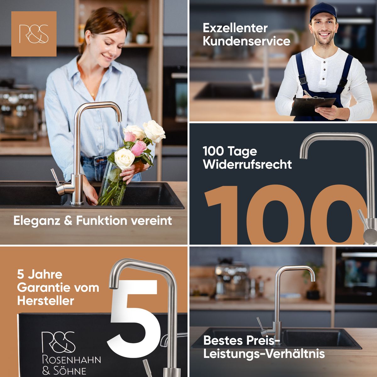 Rosenhahn & Söhne Föhr 100 Küchenarmatur 360° drehbarer Wasserhahn Küche - Armatur Küche [gebürsteter Edelstahl] - 2-fach verstellbare Spültischarmatur + Anschlussschläuche