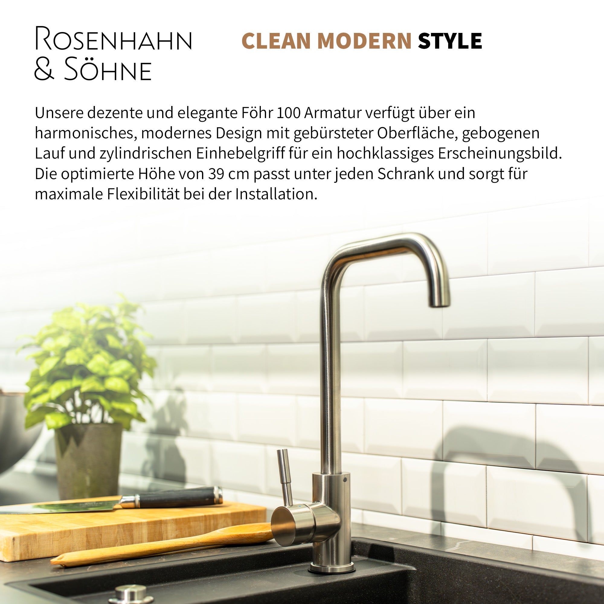 Die Küchenarmatur Föhr 100 von Rosenhahn & Söhne vereint Langlebigkeit und modernes Design. Mithilfe des drehbaren Schwenkbereichs kann jede Stelle mühelos innerhalb und außerhalb der Spüle erreicht werden. Zudem wird die Benutzung von jeder Seite ermöglicht und kann für mehr Platz ganz einfach weggedreht werden! Das edle Design in gebürstetem Stahl und die hochwertige Verarbeitung aus Messing, machen unsere Spültischarmatur zu einem echten Hingucker. Die Legierung schützt zudem vor Kalkresten und Rost. Eine ausführliche und veranschauliche Bedienungsanleitung hilft Ihnen beim problemlosen Einbau.