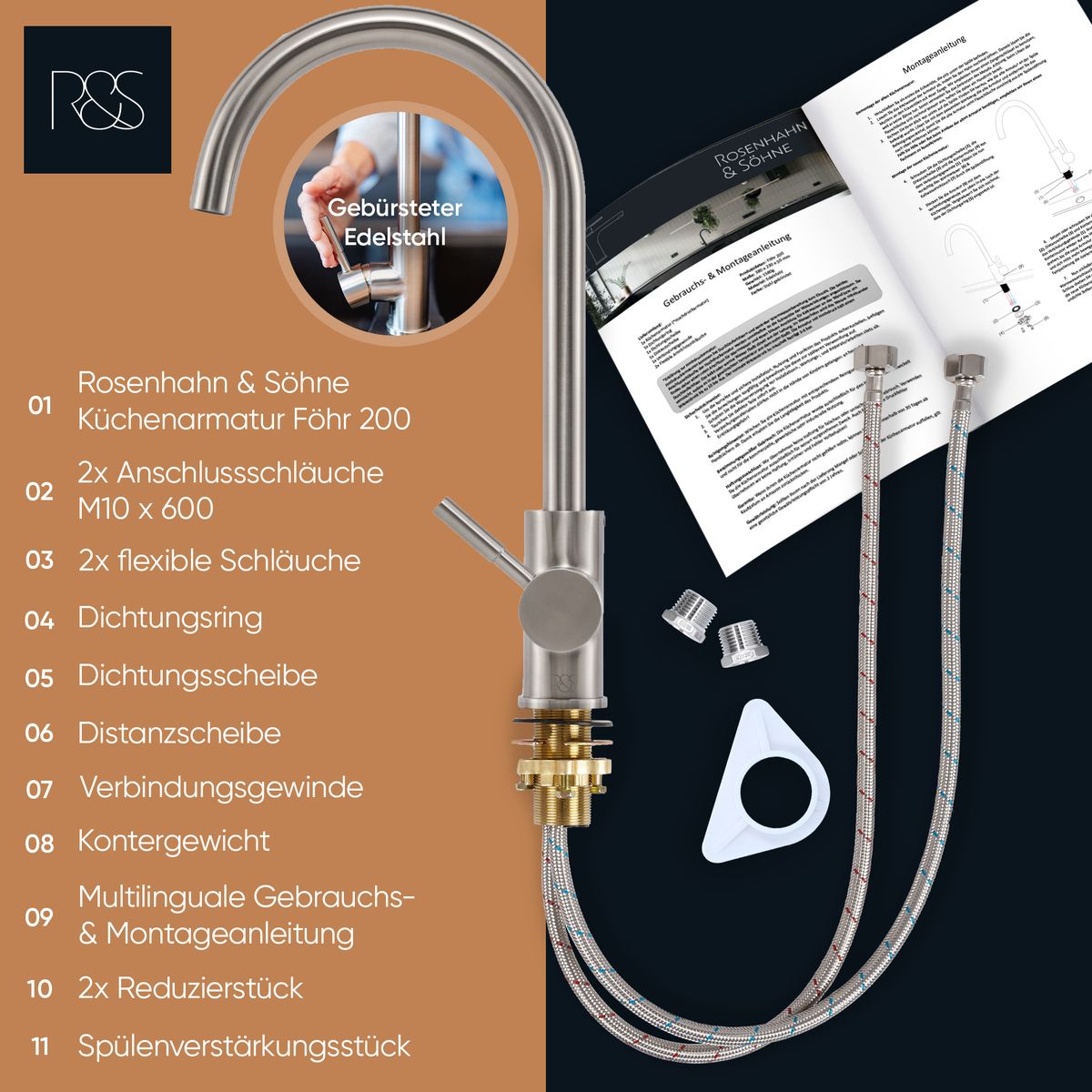 Rosenhahn & Söhne Föhr 200 Küchenarmatur 360° drehbarer Wasserhahn Küche - Armatur Küche [gebürsteter Edelstahl] - 2-fach verstellbare Spültischarmatur + Anschlussschläuche