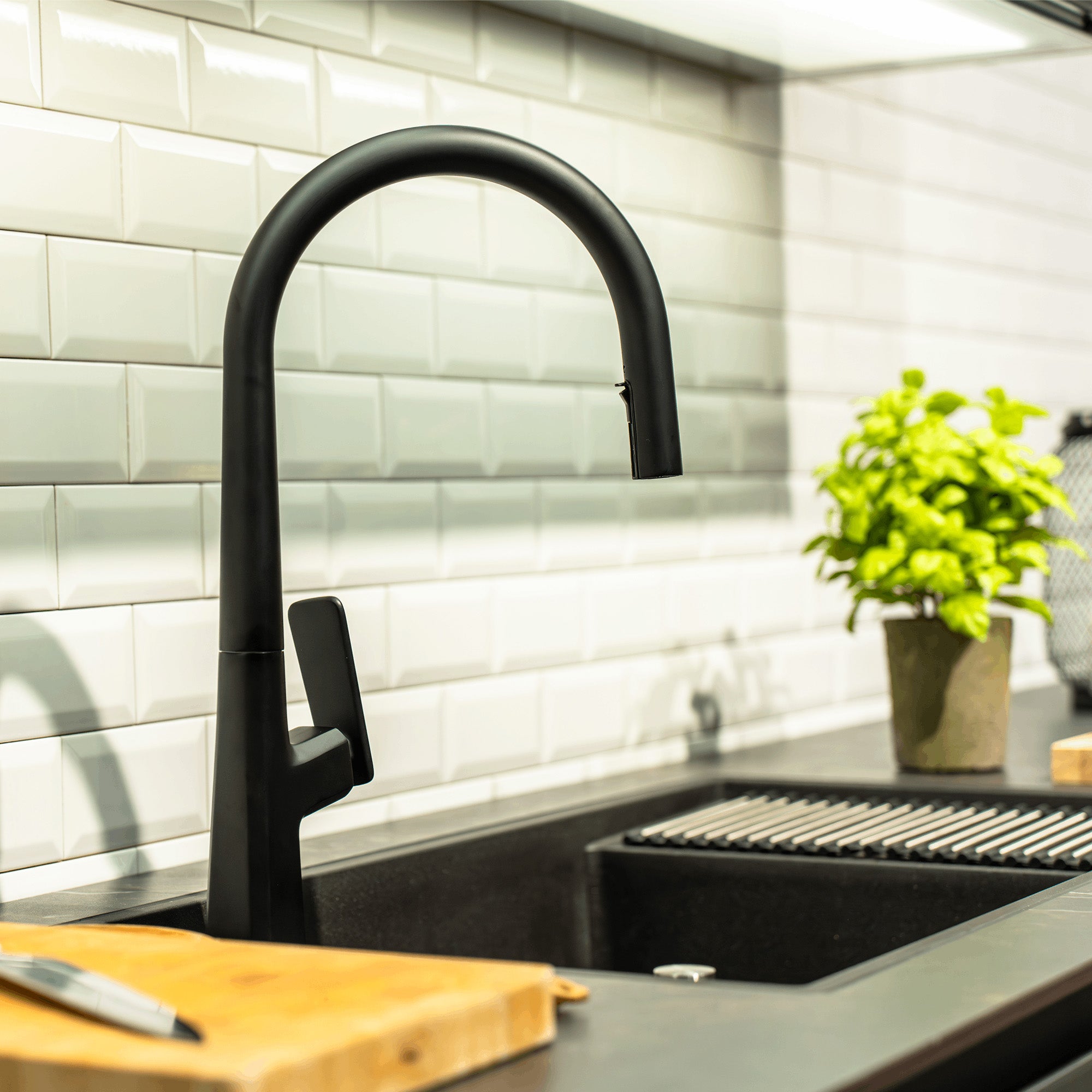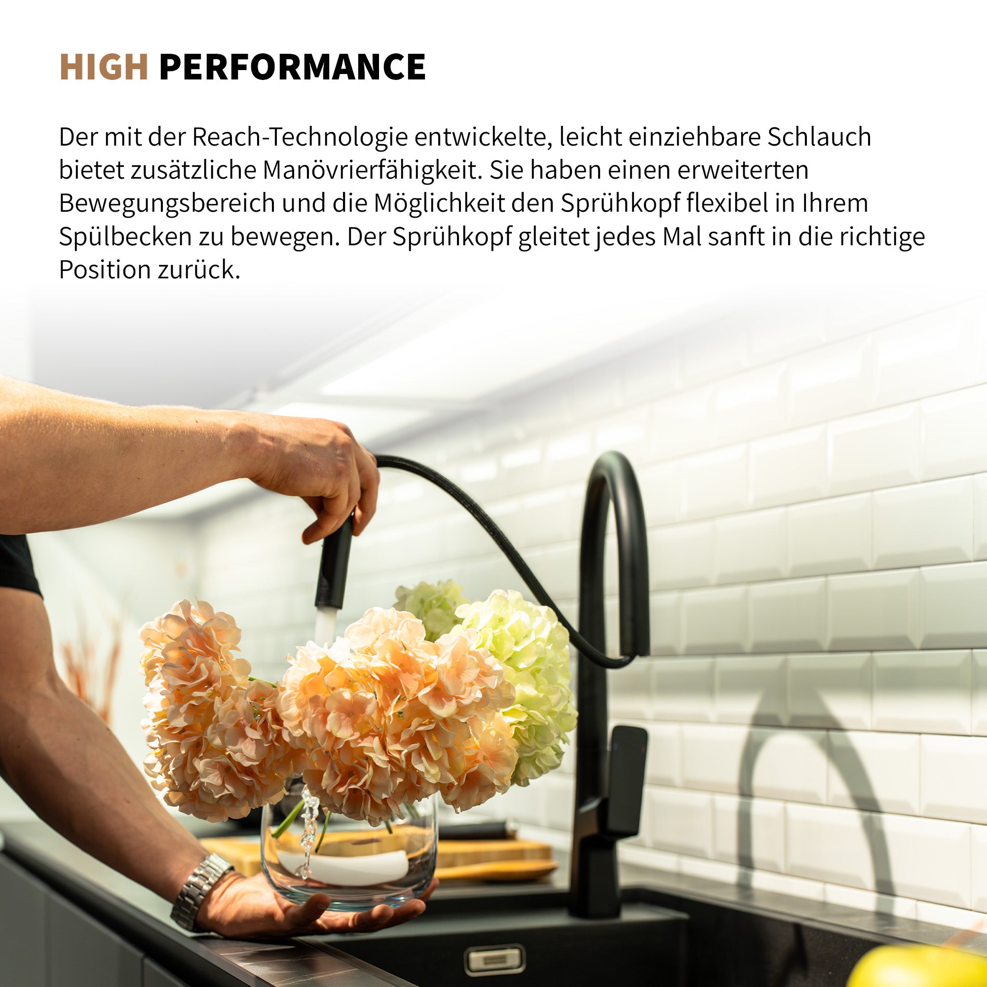 Die Küchenarmatur Sylt 100 von Rosenhahn & Söhne vereint Langlebigkeit und modernes Design. Mithilfe des drehbaren Schwenkbereichs und dem herausziehbaren Brausekopf kann jede Stelle mühelos innerhalb und außerhalb der Spüle erreicht werden. Zudem wird die Benutzung von jeder Seite ermöglicht und kann für mehr Platz ganz einfach weggedreht werden! Per Knopfdruck am Brausekopf wechselt die verstellbare Küchenarmatur vom Perlstrahl zum praktischen Brausestrahl. Das edle Design in mattschwarz und die hochwertige Verarbeitung aus Messing, machen unsere Spültischarmatur zu einem echten Hingucker. Die Legierung schützt zudem vor Kalkresten und Rost. Eine ausführliche und veranschauliche Bedienungsanleitung hilft Ihnen beim problemlosen Einbau.