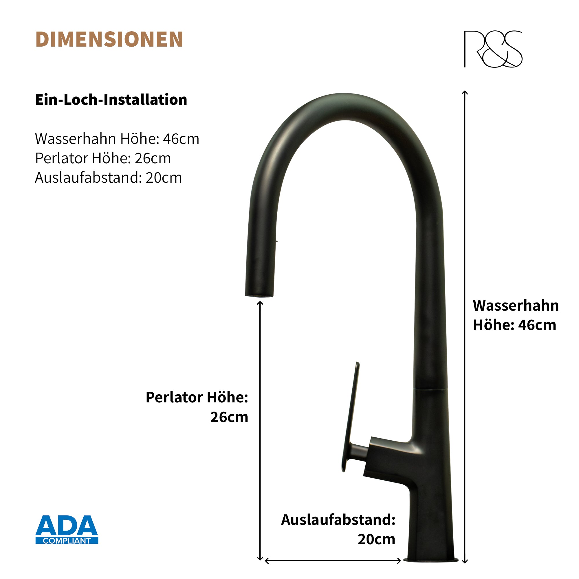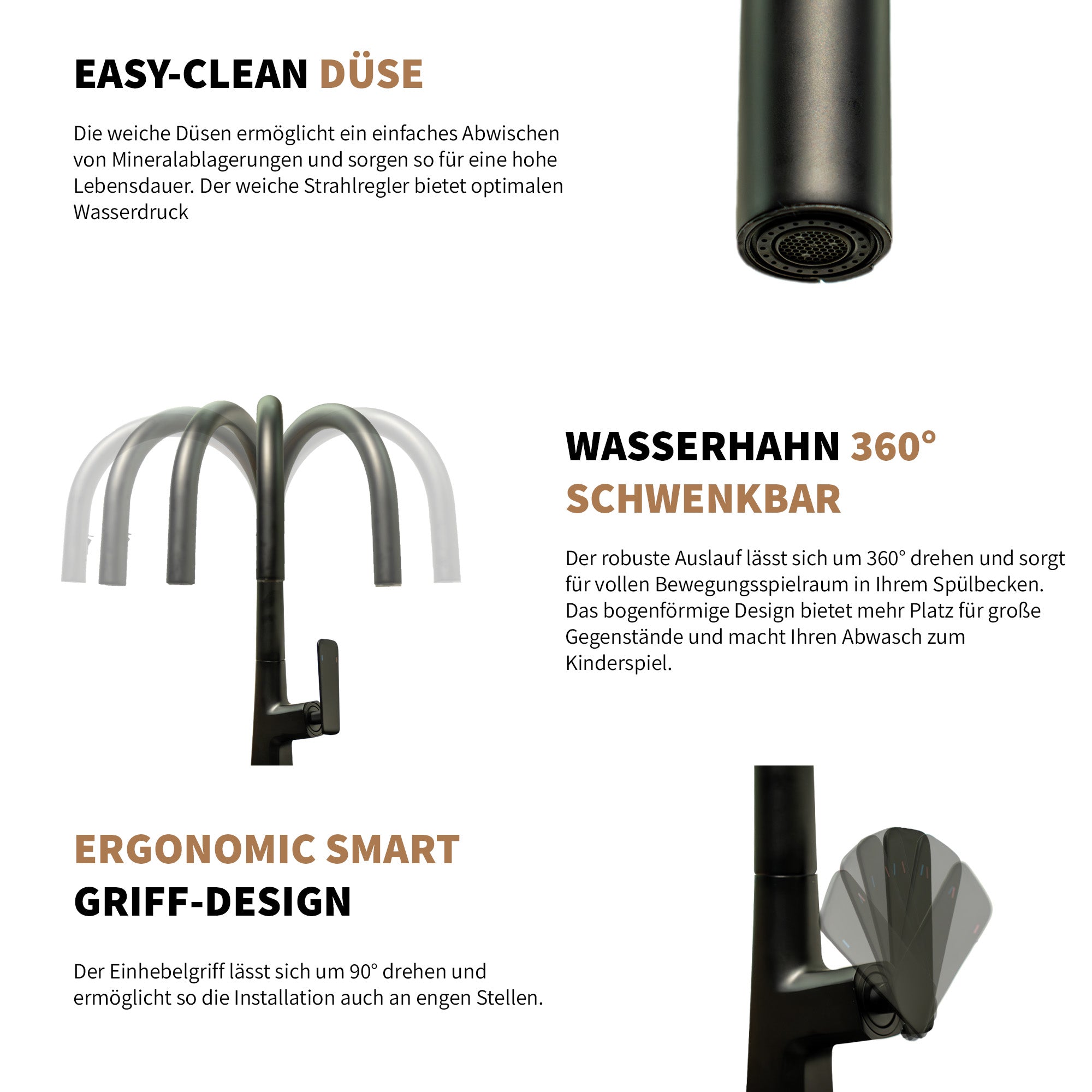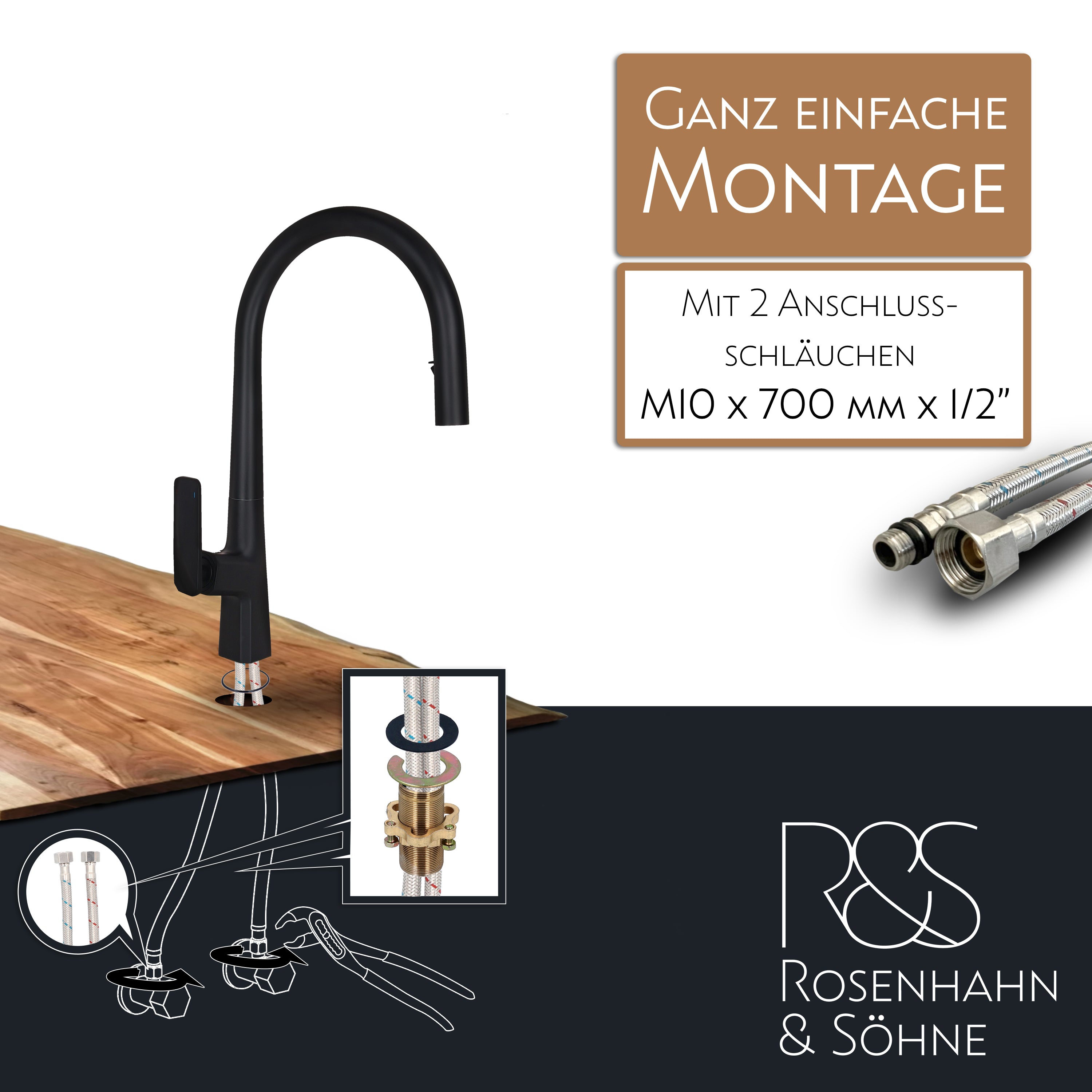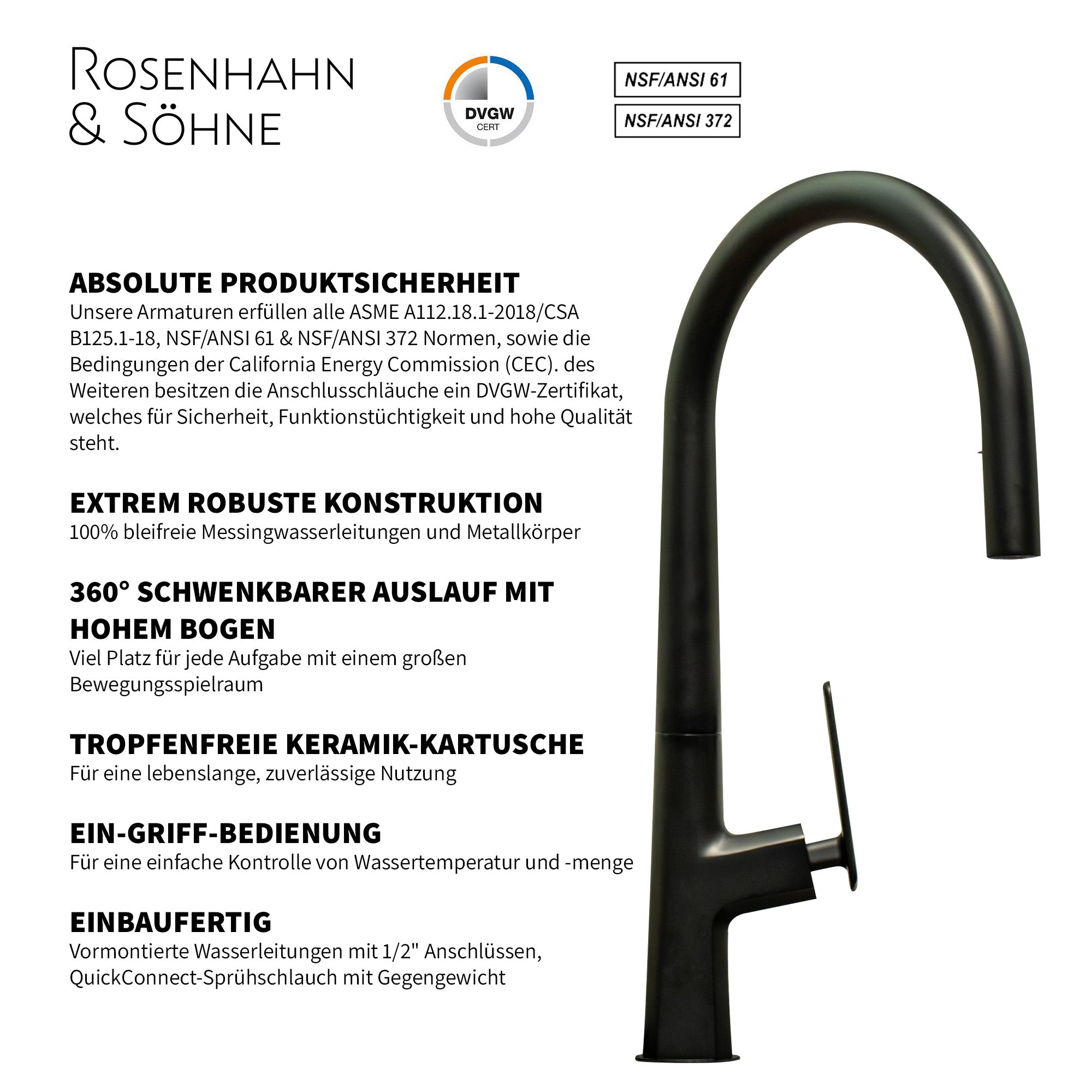 Rosenhahn & Söhne Sylt 100 Küchenarmatur mit Brause- 360° drehbarer Wasserhahn Küche - Armatur Küche [schwarz] - 2-fach verstellbare Spültischarmatur - Brause & Strahl - Anschlussschläuche