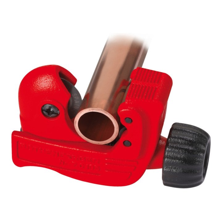 zum Schneiden von Kupfer-, Messing-, Aluminium- und dünnwandigen Stahlrohren · handliche Bauform mit kleinem Arbeitsradius (45 mm bzw./1.3/4”) ermöglicht Arbeiten an schwer zugänglichen Stellen · mühelose Druckregulierung durch großen Rändelknopf und handliche Bauform · zwei Stützrollen mit Einstich für bördelnahen Schnitt · Ersatzschneidrad siehe Art.-Nr. 4000 812 638