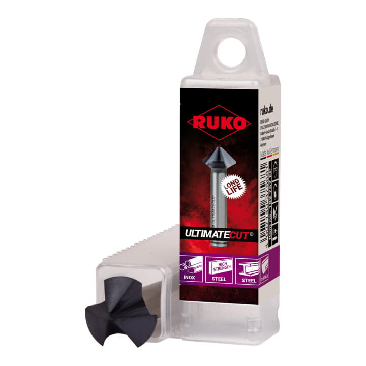 Durch die komplett neu entwickelte Schneidengeometrie des ULTIMATECUT von RUKO werden die Axial- sowie Radialkräfte, die beim Senkvorgang auf das Werkzeug einwirken, enorm reduziert. Der speziell entwickelte, variabel verlaufende Hinterschliff sorgt für einen sehr ruhigen Senkvorgang. Dieser erzeugt eine exakte, runde und ratterfreie Oberfläche der Senkung und garantiert dadurch beste Ergebnisse. Speziell entwickelte Spanraumparameter, wie Spanwinkel, Übergangsradius sowie die extra breite Spannut sorgen für eine optimale Span- und Wärmeabfuhr und ermöglichen dadurch eine sehr hohe Verschleißfestigkeit. Zudem wirkt die neue Geometrie Materialverschweißungen entgegen und reduziert die Senkkräfte enorm. Beim Senkvorgang ist nun deutlich weniger Vorschubkraft erforderlich. Materialien können wahlweise mit sehr hohen als auch niedrigen Schnittgeschwindigkeiten bearbeitet werden, ohne dabei an Qualität beim Senkergebnis zu verlieren. Der ULTIMATECUT erreicht beste Performance in fast allen Materialien und Anwendungen.