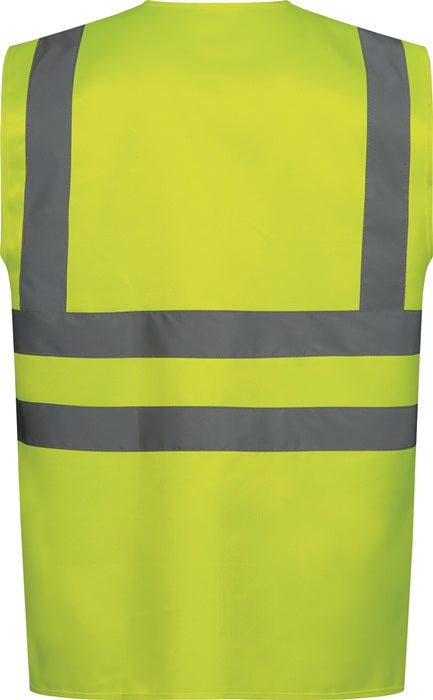 EN ISO 20471 Kl. 2, EN ISO 13688 · Obermaterial: 100% Polyester · mit Schulterreflex · mit robustem Front-Reißverschluss · einzeln im PE-Beutel verpackt · 1 Brusttaschenkombination links mit Handytasche und Stifttaschen · 1 Ausweistasche · 2 Zwei-Wege-Hüfttaschen auf Anfrage lieferbare Größen: S-7XL