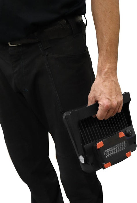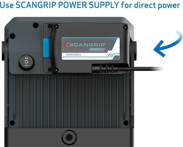 wasserdicht (IP54) · diffuses, blendfreies Arbeitslicht · einheitliche Lichtintensität und große Lichtstreuung · zwei Lichtstufen (50-100 %) · integrierter Handgriff und Stellfuß für Montage am SCANGRIP Stativ · robustes, schlagfestes Kunststoffgehäuse · die LEDs entwickeln keine Wärme und deshalb gibt es keine Brandgefahr Lieferung ohne Akku/Connector
