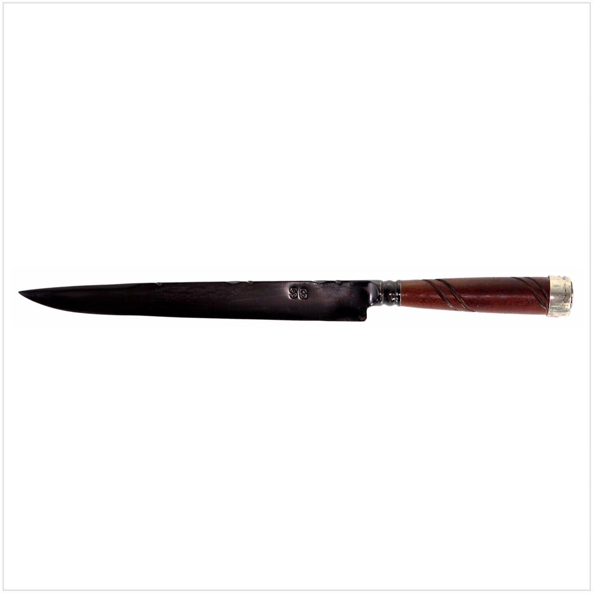 Ein herrliches Küchenmesser aus der hochwertigen Messerfertigung Serra Grande: Dieses handgefertigte "Faca Pra Lida Estreita Cabo Redondo Carbono", was übersetzt soviel bedeutet wie schmales Carbonmesser mit rundem Griff, überzeugt durch seine charakteristische, schwarze Klingenfärbung und seine verspielten Griffschnitzereien. Selbst schwierigste Aufgaben wie das Schlachten, Zerlegen und Zubereiten von Feldtieren müssen mit diesem Messer spielend bewältigt werden. Die Klingenlänge von 25,4 Zentimetern und die Klingenstärke von 3 Millimetern machen das Messer zur idealen Lösung für anfallende Küchenarbeiten mit Fleisch und Gemüse. Um höchsten Ansprüchen zu genügen, werden nur die besten Werkstoffe bei der Fertigung verwendet: Die Klinge besteht aus dem rostfreiem Carbon Federstahl ( AISI 5160 ) welcher extrem zäh, flexibel und ermüdungsbeständig ist. Der edle Griff wird aus dem Holz des Imbuia gefertigt, auch Pfefferbaum oder brasilianische Walnuß genannt. Das dunkelbraune Holz mit seiner kleinporigen Struktur weist dunkle Streifungen auf und wirkt optisch wie Nussbaumholz, obwohl es sich nicht um einen Nußbaum handelt. Es ist hart und langlebig, durch die sorgfältige Trocknung, Glättung und Politur überzeugt es mit einer wunderbaren Griffigkeit.