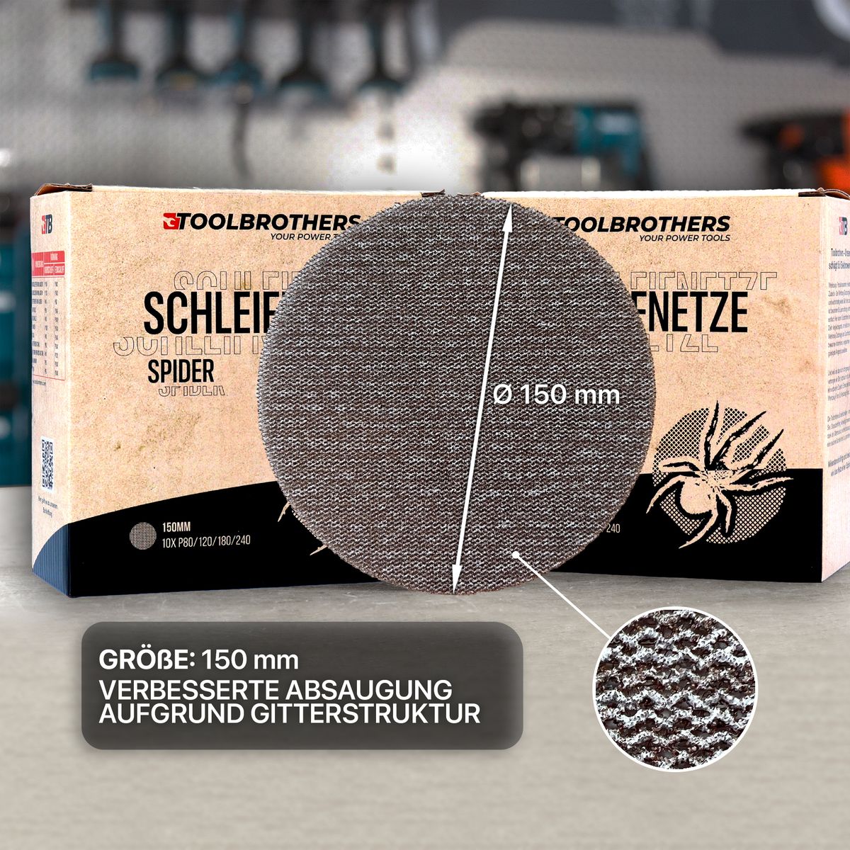Toolbrothers SPIDER Schleifset Netz 150 mm 2 Packungen 80x Schleifnetze Klett je 20x P80 / P120 / P180 / P240 für Hartholz, Weichholz, Lack, Stein, Stahl, Aluminium, Furnier