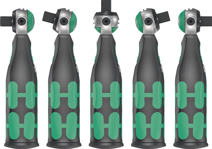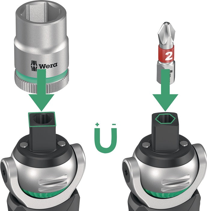 mit Schwenk- und Umschaltknarre 8009 Zyklop · mit Kombiwerkzeugaufnahme geeignet für Steckschlüssel-Einsätze 10,0 mm (3/8″)-Vierkantantrieb und Bits mit 6,3 mm (1/4″)-Sechskantantrieb (C 6,3 und E 6,3) · mehrkomponentiger Kraftform-Griff - im Griff integriertes, unverlierbares, freischwenkbares Magazin mit 12 Bits · frei schwenkbarer Knarrenkopf (definierte Stellung bei 0°, 15° und 90° nach links und rechts) · in 0°-Stellung einsetzbar wie ein konventioneller Schraubendreher · Links-/Rechtsumschaltung · magnetische Direktaufnahme