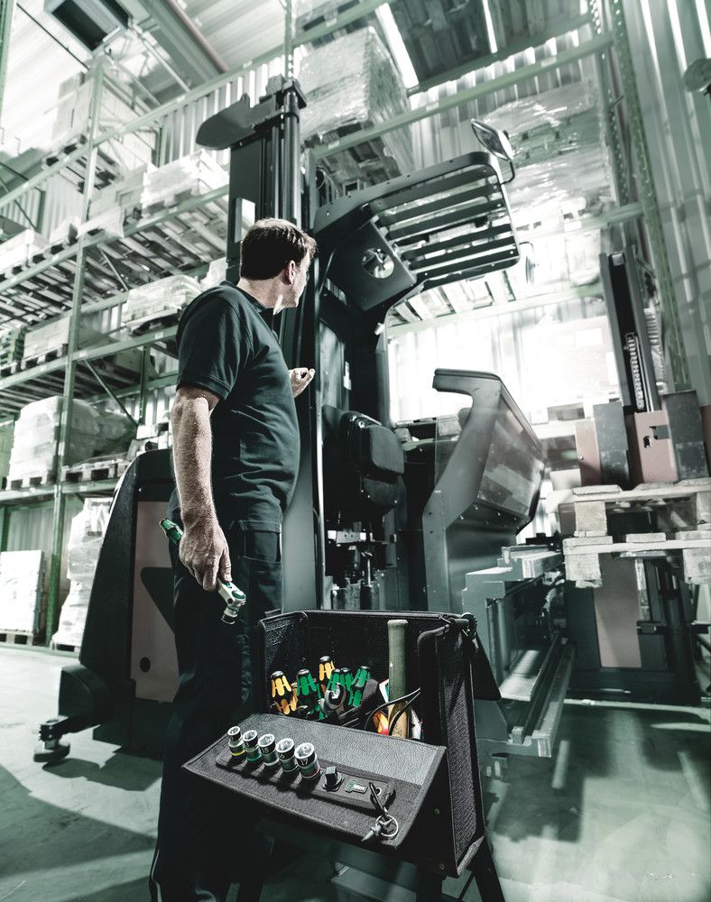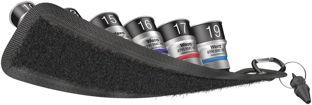 12,5 mm (1/2 ″)-Vierkantantrieb · mit Vliesrücken und Klettklebestreifen zur einfachen Befestigung z. B. am Regal, Werkstattwagen und Wera 2go Werkzeugtransportsystem · leichtgängiger Drehmechanismus für sichere Aufbewahrung und einfache Entnahme
