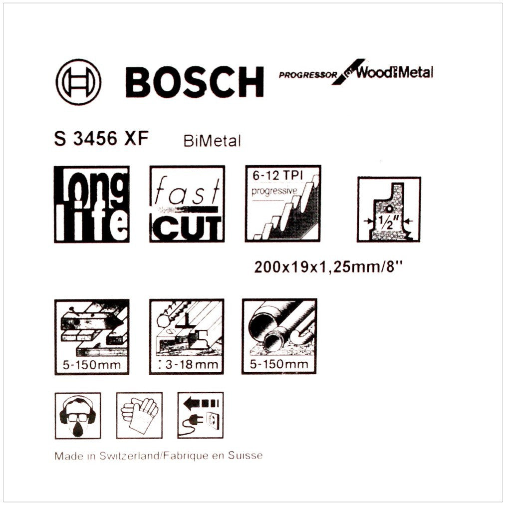 Die Bosch Säbelsägeblätter Progressor for Wood and Metal S 3456 XF eignen sich zum Sägen von Holz mit Nägeln, Spanplatten, Metallblechen, Aluminiumprofilen und GFK/Eproxy. Die aus BiMetal hergestellten Sägeblätter sind besonders robust und langlebig.