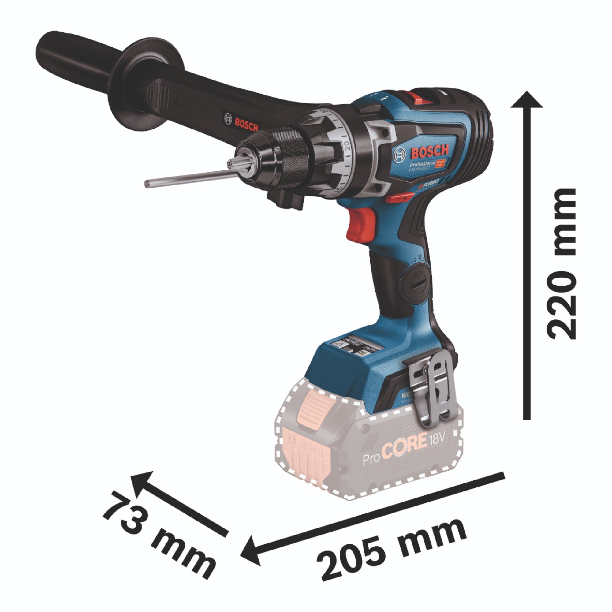 Il trapano avvitatore a batteria Bosch GSR 18V-150 C Professional convince per la sua coppia di 150 Newton metri abbinata alla tecnologia Biturbo. È inoltre dotato del preciso Rilevamento Elettronico dell'Angolo, che garantisce sempre l'angolo corretto per le viti lunghe. È presente anche il KickBack Control. Il robusto mandrino in metallo e la scatola ingranaggi in metallo promettono una lunga durata e tanto divertimento durante l'uso. È compatibile anche il modulo di connettività Bosch (non incluso). Il GSR 18V-150 C Professional offre risultati ottimali nell'avvitamento e nella foratura di legno e metallo, in particolare quando si eseguono forature di grande diametro, ad esempio con seghe a tazza fino a 150 mm. Naturalmente, è installata una luce a LED. Uno dei punti di forza della macchina sono le tre impostazioni di coppia. Si tratta di 84 Nm in modalità soft, 100 Nm in modalità hard e 150 Nm nella gamma massima. Importante da sapere: I dispositivi Biturbo devono essere utilizzati con batterie ProCore da 5,5 ampere. Con batterie più piccole, le prestazioni del dispositivo sono ridotte. Bosch Professional è un produttore leader di elettroutensili di tutti i tipi, caratterizzato da una lunga tradizione e da una lavorazione di alta qualità.