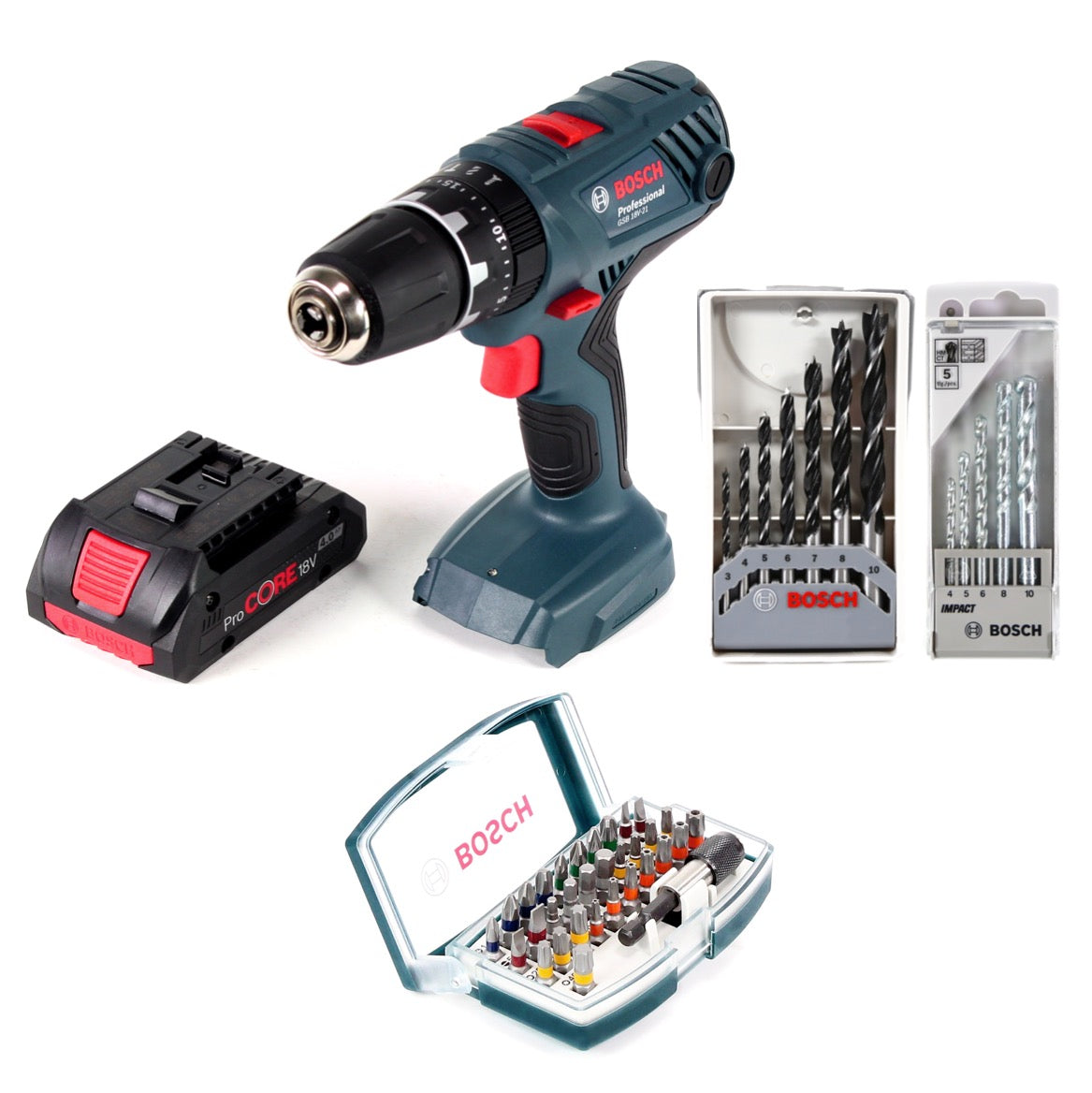Bosch Professional GSB 18V-21 Akku Schlagbohrschrauber 18V 55Nm + 1x Akku ProCORE 4,0Ah + Bit- und Bohrer-Set