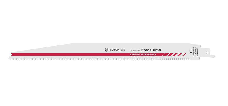 Das Bosch S 1256 XHM Säbelsägeblatt Progressor for Wood and Metal bietet eine ultimative Lebensdauer. Dank der geschliffenen Carbide  Zähne ist das Schneiden von hochfesten Stahl sowie von Holz kein Problem. Durch die progressiv angeordneten Zähne sind schnelle Schnitte in Materialien mit unterschiedlichen Dicken möglich. Der breite verjüngte Körper und die dicke Wandstärke sorgen für die nötige Stabilität bei Abrissarbeiten. Die Zähne des Sägeblattes wurden mit der Carbide Technology an den hochelastischen Stahlkörper geschweißt. Durch die Gesamtlänge von 300 mm ist eine Schnittleistung von bis zu 250 mm möglich. Dank dem 0,5 Zoll Universalschaftsystem ist das Sägeblatt mit den gängigsten Säbelsägen kompatibel.