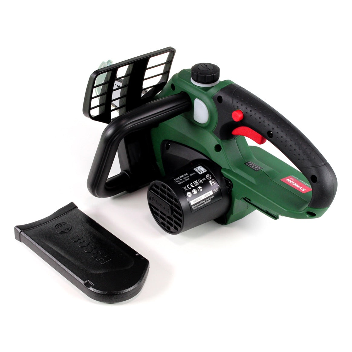 Questa motosega Bosch è eccezionalmente leggera. Pesa solo 2,5 kg senza batteria. Il sistema SDS ottimizzato di Bosch consente di cambiare e tendere la catena senza l'ausilio di utensili. La protezione della guida stabilizzatrice con artigli in acciaio garantisce anche la pulizia dei sottosquadri con danni minimi ai rami. È possibile passare facilmente da un impianto di taglio all'altro, rimuovendo gli scarti.