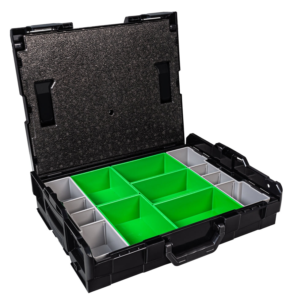 Con il set Insetbox D3 LB 102 avrete sempre a portata di mano i vostri piccoli pezzi. Sia che li utilizziate in officina, in combinazione con il sistema L-BOXX o ProClick, sono adatti ovunque. Il set è composto da 2 Insetbox U3 in grigio, con 6 divisori, e 5 Insetbox D3 in verde.