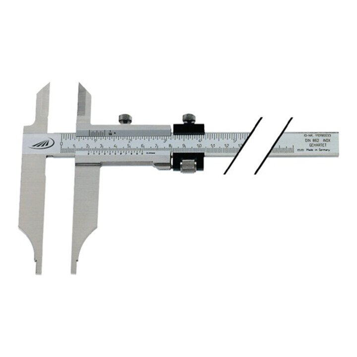 con punte a lama - scala e nonio cromati opachi - graduazione e scala altamente precisa grazie all'etichettatura laser - graduazione principale abbassata - misura interna ed esterna Attacco per misure interne: fino a 300 mm Campo di misura = 10 mm 500 - 1000 mm Campo di misura = 20 mm