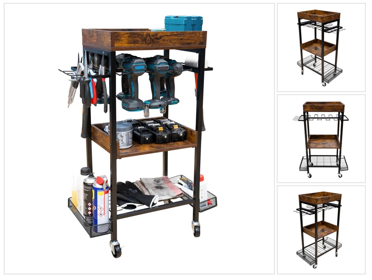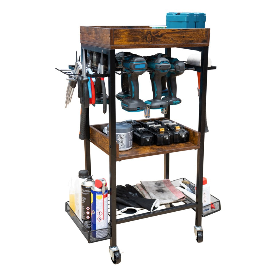 Il carrello da officina Toolbrothers è un vero e proprio richiamo visivo in qualsiasi officina, cantina o garage. Gli attrezzi sono organizzati in modo semplice e veloce e sono sempre a portata di mano. È possibile riporre facilmente fino a sette avvitatori a batteria. C'è anche spazio sufficiente per caricabatterie o batterie. Sul piano inferiore è possibile riporre custodie o organizer, ad esempio. Naturalmente sono presenti anche dei ripiani. Ciò significa che ogni utensile può essere utilizzato in modo rapido e semplice. Il carrello da officina ha anche la possibilità di fissare lateralmente cacciaviti e altri utensili manuali. Il ripiano superiore può essere utilizzato universalmente grazie alle pareti laterali, in modo da poter utilizzare qualsiasi utensile o ausilio in modo rapido ed efficiente.