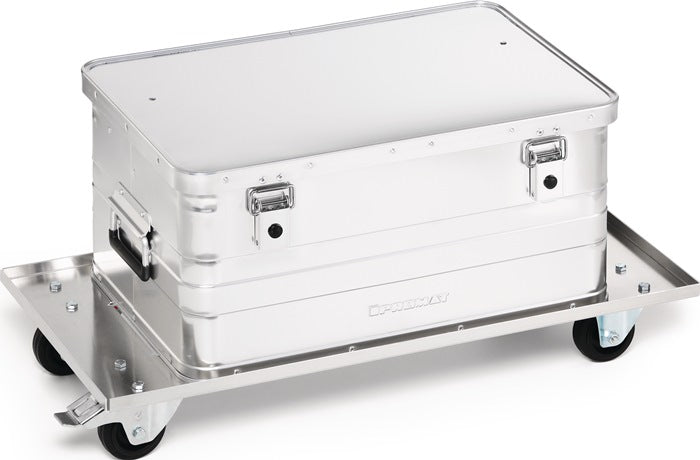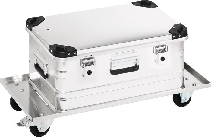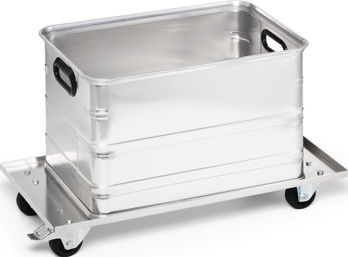 Portata 50 kg - zincato - 2 ruote piroettanti e 2 fisse, 1 ruota piroettante con freno - pneumatici in gomma, ruota Ø 80 x 25 mm - per cassette in alluminio da 29 l a 90/91 l e cassette da trasporto in alluminio da 28 l a 80 l