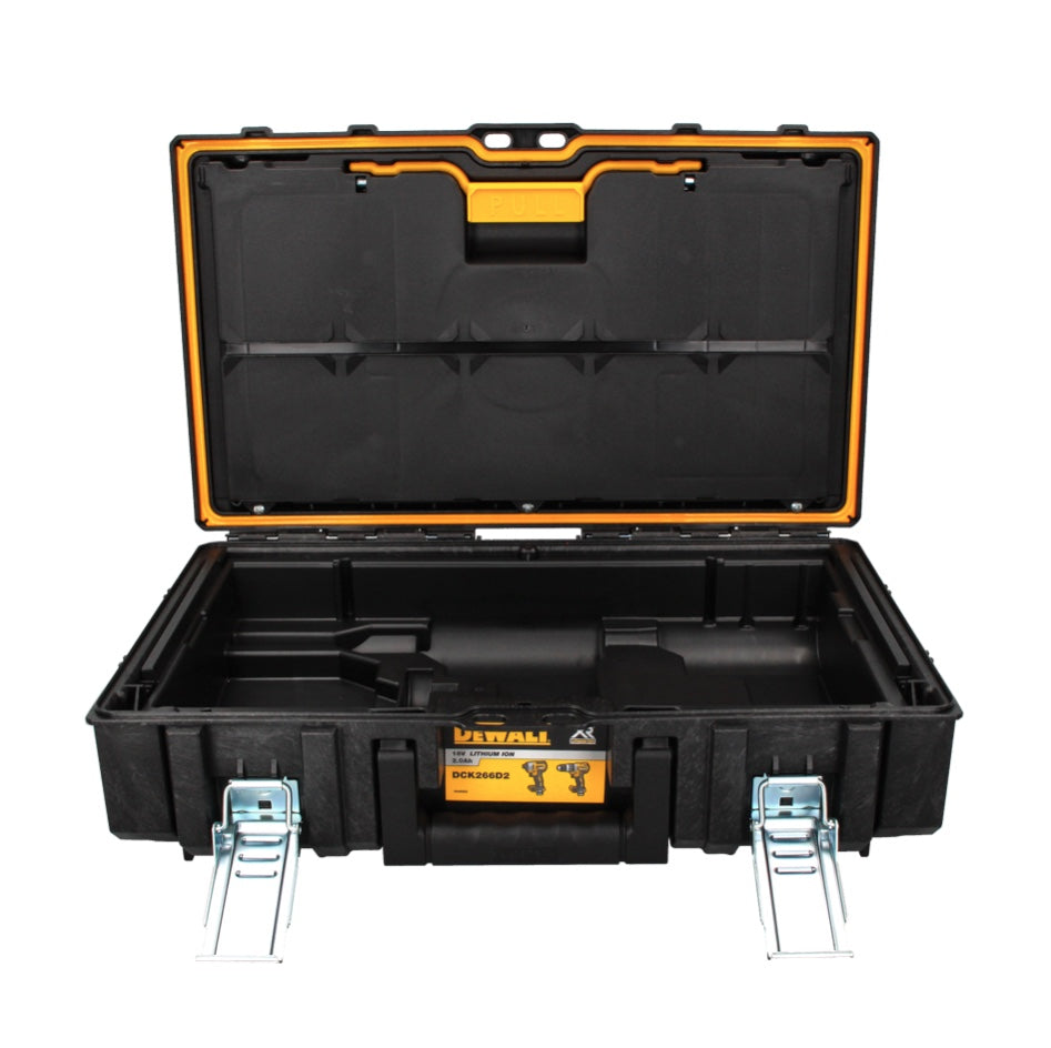 La DeWalt Tough Box DS 150 è una valigetta super resistente agli urti e robusta con pareti spesse 4 mm. È impilabile, resistente alla polvere e agli schizzi. Inoltre, la DS 150 è dotata di un pulsante per bilanciare la pressione dell'aria all'interno e all'esterno della valigetta. All'esterno, gli occhielli incassati possono essere utilizzati per inserire lucchetti e un gancio in acciaio può essere utilizzato per appenderla alla parete. Anche le chiusure in acciaio inox sulla parte anteriore sono estremamente robuste e resistenti alla ruggine. Le maniglie della Tough Box DS 150 DeWalt sono realizzate in 2 materiali (polipropilene + elastomero termoplastico TPR), quindi sono particolarmente robuste e resistenti agli urti. L'interno presenta un ampio scomparto e un inserto rimovibile per due batterie da 2,0 Ah, un avvitatore a impulsi, un cacciavite e un caricabatterie. Una seconda area nel coperchio di questa valigetta funge da deposito aggiuntivo che può essere riempito con punte, trapani, ma anche tasselli, viti e altri accessori.