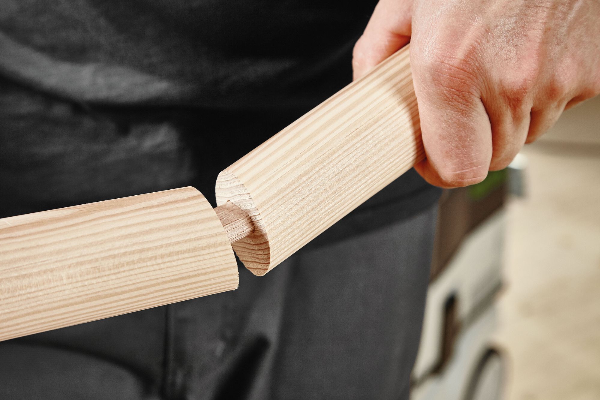- Die seitlich überstehenden Führungsrippen zentrieren den Dübel mittig in der DOMINO Fräsung und sorgen somit für ein perfektes Ausrichten der Werkstücke