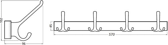 Gancio in metallo leggero - anodizzato color argento - montato su listello profilato - 2 punti di fissaggio nascosti sul retro (fornito senza viti o tasselli!) - sporgenza 96 mm - altezza 102 mm