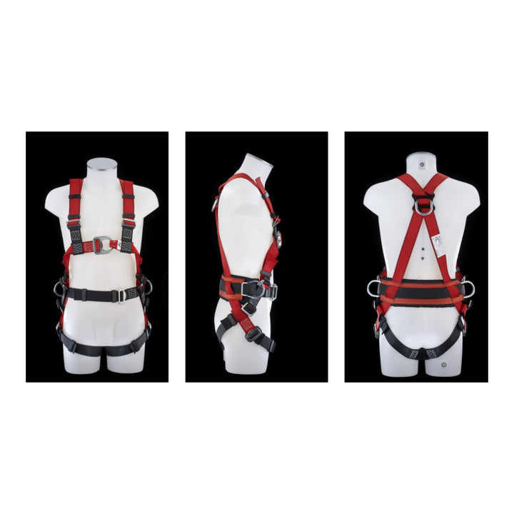 EN 361, EN 358 - con sezione dorsale imbottita da 100/140 mm - due occhielli di sicurezza (anteriore e posteriore) e due occhielli di posizionamento laterale, che consentono all'utente di posizionare la propria postazione di lavoro - possibilità di regolazione per gli spallacci, le cinghie delle gambe (con telaio passante) e la cintura di sicurezza - cintura in vita con telaio passante