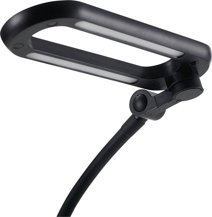 con cavo di collegamento di circa 3 m - versione larga - per un'illuminazione ottimale della postazione di lavoro su un'ampia superficie - testa della lampada con 3 snodi e tubo flessibile lungo 600 mm, nonché cavo di collegamento H05RN-F 2G1.0 di 3 m - l'oggetto illuminato può essere ispezionato direttamente attraverso la testa della lampada Caratteristiche tecniche: 230 V, 9 watt LED largo, 230 V/ 12 V, 3 livelli di luce: 100% (750 lumen), angolo di apertura del fascio di luce 100°, colore della luce 6.300 K, illuminamento 100%=302 lux, 60%=178 lux, 35%=108 lux (1 m)