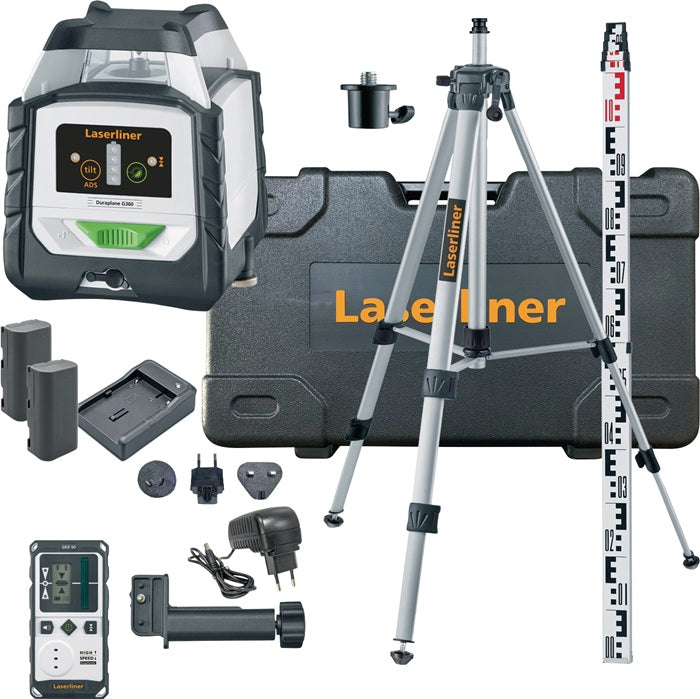 - Duraplane G360, RangeXtender G 60, treppiede compatto da 175 cm, asta di livellamento telescopica da 3 m, adattatore con filettatura da 5/8″, 2 batterie agli ioni di litio con stazione di ricarica esterna, unità di alimentazione/ricarica incl. adattatore internazionale, custodia per il trasporto. adattatore internazionale, custodia per il trasporto