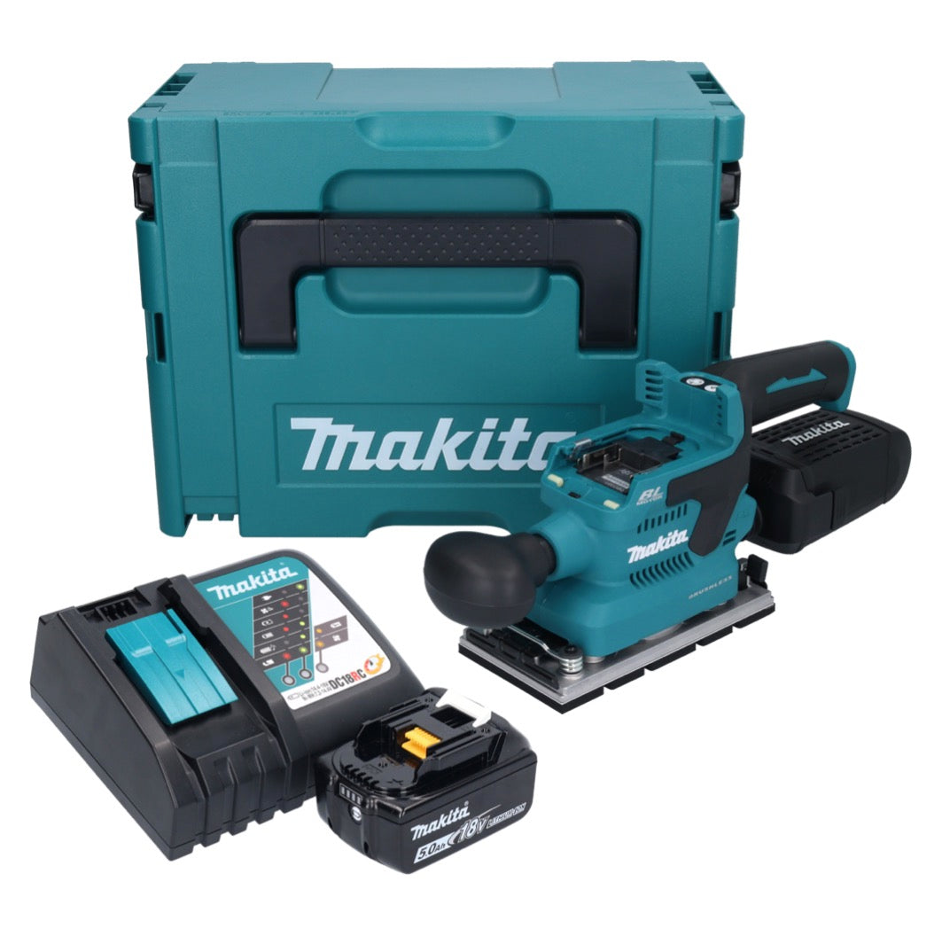 Makita DBO 381 RT1JU 18 V 93 x 185 mm Levigatrice vibrante a batteria senza spazzole + 1x batteria 5,0 Ah + caricabatterie + Makpac