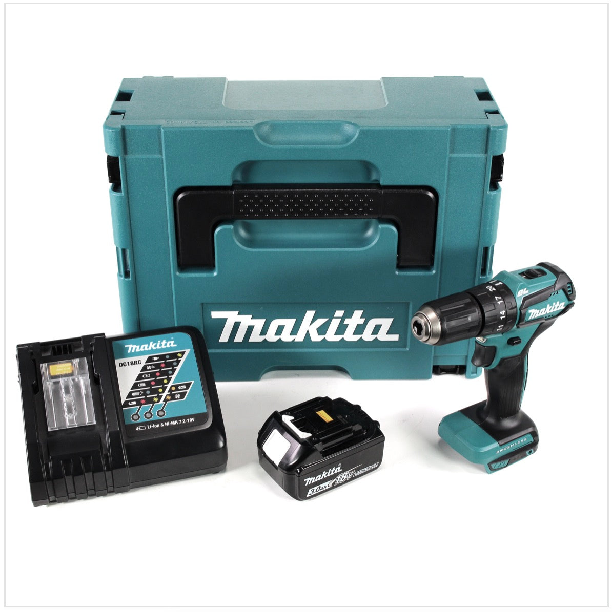 Makita DHP 483 RF1J Trapano avvitatore a percussione brushless a batteria 18 V in valigetta MAKPAC + 1x Batteria 3,0 Ah + Caricatore rapido