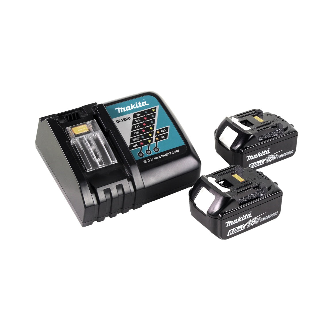 Die Makita DHS 710 Handkreissäge überzeugt durch seinen umweltfreundlichen und kostensparenden 2x 18 V-Antrieb und der stufenlosen Winkeleinstellung bis zu 45°. Das Gerät eignet sich ideal zur Küchenmontage, zum Innenausbau und bei Dacharbeiten. Mit der Makita DHS 710 erreicht man mühelos eine Schnittiefe von bis zu 68,5 mm. Die Grundplatte besteht aus robustem Aluminium-Druckguss. Im Makpac kann die Maschine einfach transportiert und verstaut werden. Der Makita BL 1860 B ist ein 18 Volt starker Li-Ion 6 Ah / 6000 mAh Akku mit LED-Ladestandsanzeige. Der Akku überzeugt durch seine erhöhte Ausdauer und Leistungsabgabe, bei einem lediglich nur 40 Gramm höheren Gewicht gegenüber dem 5 Ah Akku von Makita. Die vollständige Ladezeit beträgt zudem nur 55 Minuten (mit einem DC 18 RC Ladegerät), was den Akku im Vergleich zur Arbeits- bzw. Standzeit extrem schnell wieder einsatzfähig macht. Wie gewohnt ist der 1860 B  mit allen Geräten der 18 Volt Klasse von Makita kompatibel und besitzt eine lange Laufzeit und Lebensdauer danke der Li-Ion Technologie. Das Makita DC 18 RC ist ein Akku Schnellladegerät für 9,6 - 18 Volt Li-Ion Akkus von Makita. Das Ladegerät kontrolliert und steuert durch einen integrierten Mikroprozessor permanent die Spannung und Temperatur, wodurch optimale Ladevorgänge garantiert und zugleich die Akkus durch eine optimal geführte Kühlluftsteuerung geschont werden. Das Schnellladegerät lädt die 18 Volt Akku Generation von Makita extrem schnell auf, was zu sehr kurzen Ladepausen bzw. zu einem fließenden Arbeitsvorgang führt, sobald z.B. zwei Akkus vorhanden sind.