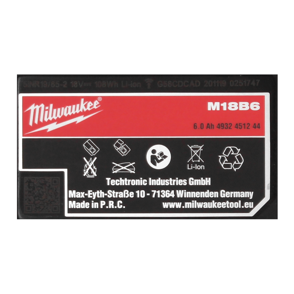 Milwaukee M18 B6 Batteria 18 V / 6,0 Ah / 6000 mAh ( 4932451244 )