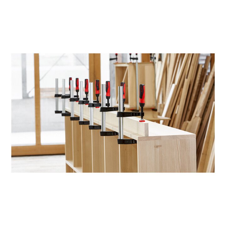 Forza di serraggio fino a 6.000 N - impugnatura in plastica bicomponente di alta qualità - piastre di pressione sostituibili senza attrezzi (a partire da 80 mm di profondità della gola) - con tappi di protezione sulle superfici di serraggio - robusta guida a profilo cavo con nervature - protezione antiscivolo BESSEY (a partire da 80 mm di profondità della gola)