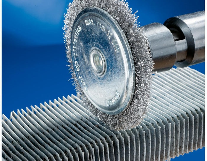 per la pulizia, la rimozione della polvere, la levigatura, la pulizia dei cordoni di saldatura, la sbavatura leggera e la rimozione della corrosione e della vernice - il materiale di rifinitura in filo d'acciaio ha un'elevata resistenza alla trazione e alla flessione - garantisce un'usura ottimale del filo e una lunga durata, anche in applicazioni di spazzolatura estreme Il filo d'acciaio può resistere a temperature fino a 300 °C. Gambo Ø 6 mm