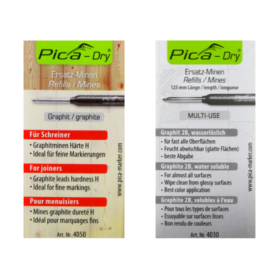 La mina Pica Dry Graphite è adatta a quasi tutte le superfici, asciutte o umide, lisce o ruvide, polverose o oleose, chiare o scure. Le marcature possono essere rimosse dalle superfici lisce con un panno umido.  Le mine sono già affilate e possono essere riposte nella pratica scatola di plastica Pica Dry. La mina di grafite Pica Dry nella speciale durezza H è particolarmente adatto per lavori di carpenteria e per la lavorazione del legno. Le mine affilate consentono una marcatura fine su superfici asciutte. Le marcature disegnate non possono essere rimosse con un panno umido.