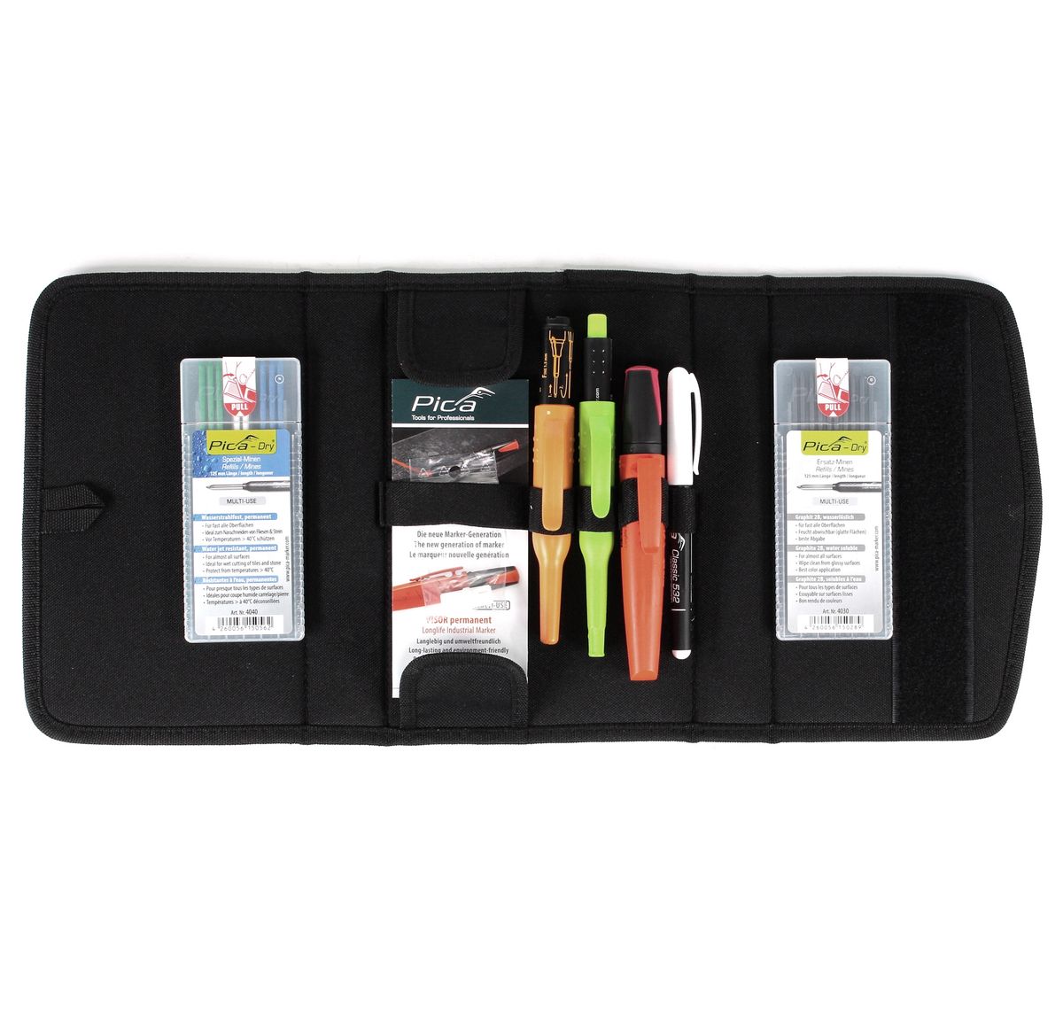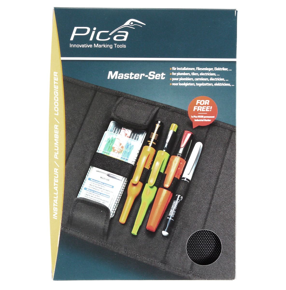 Il Pica Master Set Plumber è un set di marcatura pratico e compatto. È anche perfetto per piastrellisti ed elettricisti. Il set è caratterizzato da durata e semplicità di funzionamento. Il set può essere ricaricato con diversi cavi per diversi scopi ed è quindi universalmente applicabile. I cavi sono ideali per la marcatura e sono caratterizzati da una performance di marcatura estremamente lunga.