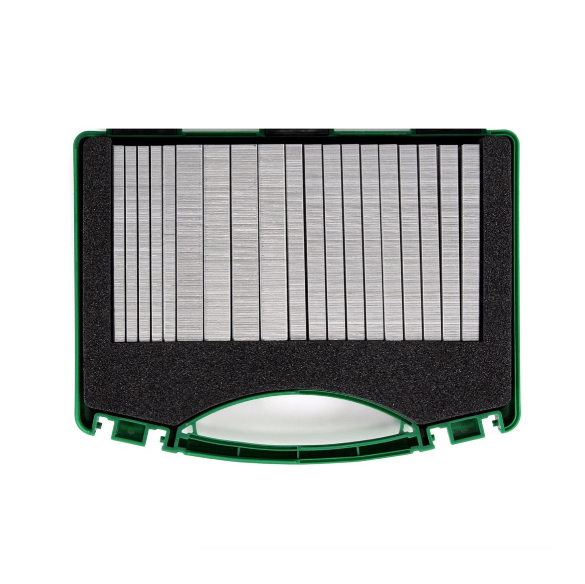 Prebena PF-BOX Staples contiene un totale di 9.000 punti metallici zincati di 3 diverse dimensioni, adatti alla cucitrice pneumatica Prebena DNPF16. Le graffette vengono consegnate in una pratica scatola A. Prodotto in Germania.