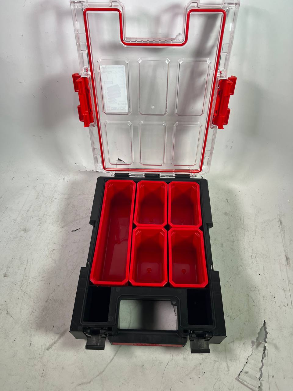 Qbrick System ONE Organizer M Plus è un modello superiore dell'M-Organizer della gamma modulare ONE-Organizer, che può essere combinato tra loro in numerose configurazioni. L'Organizer M Plus è dotato del sistema brevettato Easy Access System che, grazie a speciali elementi di connessione, consente di accedere facilmente a ciascun modulo senza doverlo staccare, aumentando notevolmente l'ergonomia del lavoro. Di serie, l'Organizer M Plus è dotato di 5 secchi per gli accessori, tra cui 4 secchi più piccoli e un secchio lungo per riporre e trasportare gli elementi longitudinali dell'officina. Inoltre, il contenuto dell'organizer è protetto dall'ingresso di acqua e polvere grazie a una guarnizione flessibile inserita nel coperchio in policarbonato. Una speciale chiusura del coperchio dell'organizer impedisce la caduta incontrollata.