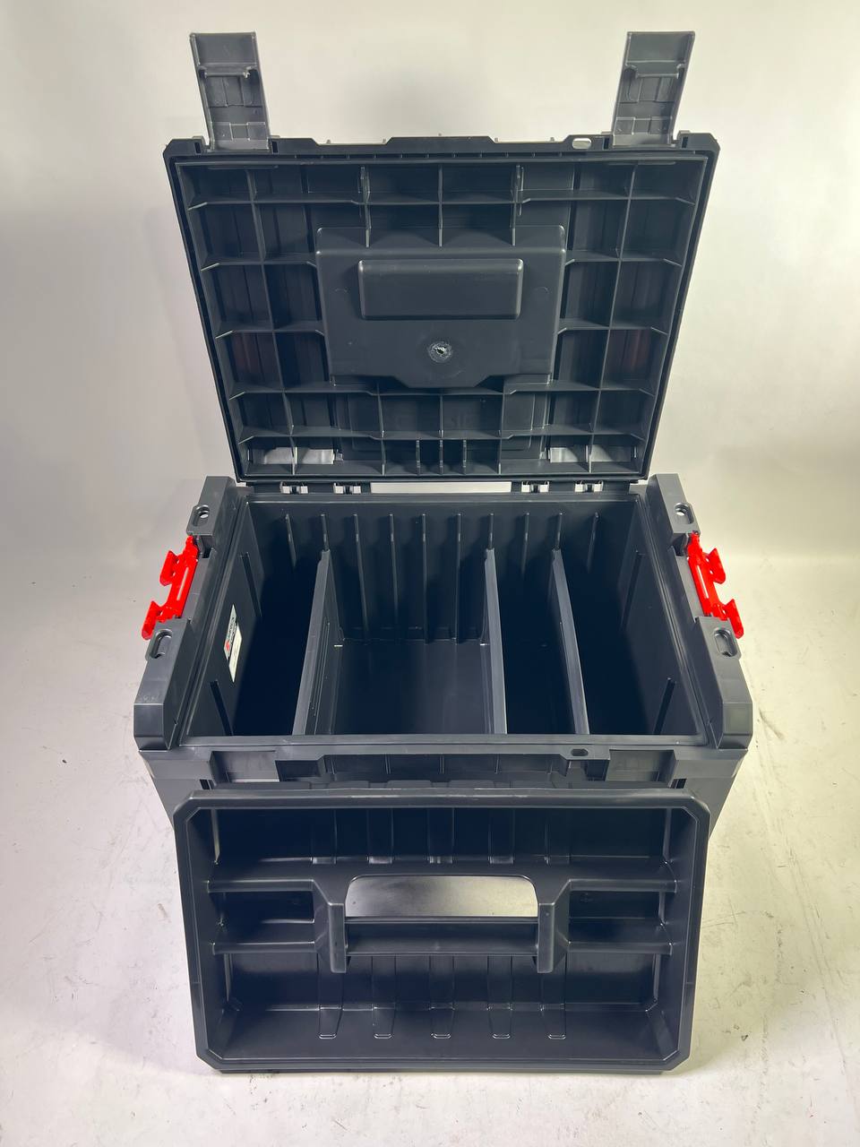 La cassetta degli attrezzi Qbrick System PRO è una spaziosa cassetta modulare che offre già di serie un'ampia gamma di accessori: una guarnizione flessibile integrata nel coperchio che garantisce un'elevata resistenza alla polvere e all'acqua, 3 scomparti regolabili, un ampio ripiano ed elementi laterali di collegamento e fissaggio in poliammide super resistente nella parte anteriore. Le speciali guide della cassetta degli attrezzi QS PRO consentono di collocare il QS TWO Multi Organiser, utilizzato per riporre i piccoli accessori da officina.